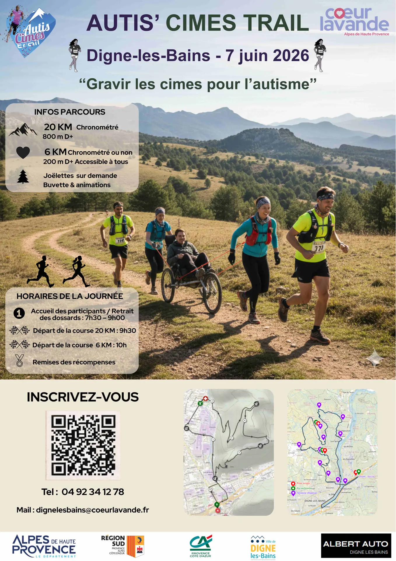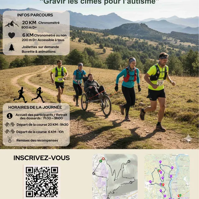 Que vous soyez coureur confirmé, amateur ou simplement marcheur, chacun pourra participer à cet événement convivial et porteur de sens. L’Autis’Cimes Trail, c’est bien plus qu’une course : c’est une action qui unit sport et handicap, au profit du pôle autisme de l’association Cœur Lavande. Une belle occasion de soutenir une cause essentielle de l’autisme tout en partageant un moment de solidarité et de convivialité.