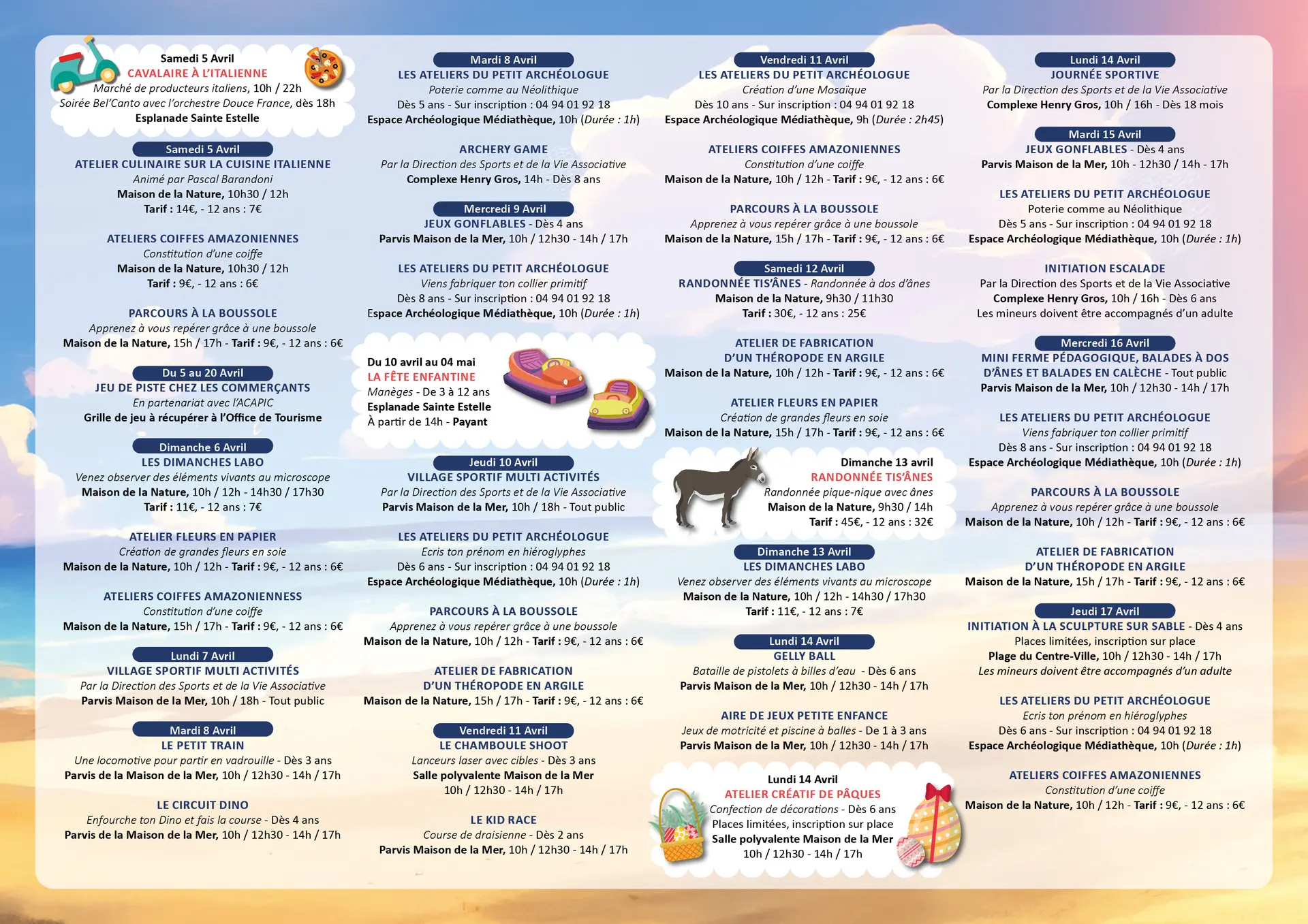 La SPL Maures Évènements, le Service des Sports, l'Espace Archeo et la Maison de la Nature vous préparent un joli programme d'animations pour occuper nos petites têtes blondes durant les vacances scolaires. Ateliers créatifs, initiations sportives, activités ludiques... Il y en aura pour tous les goûts !