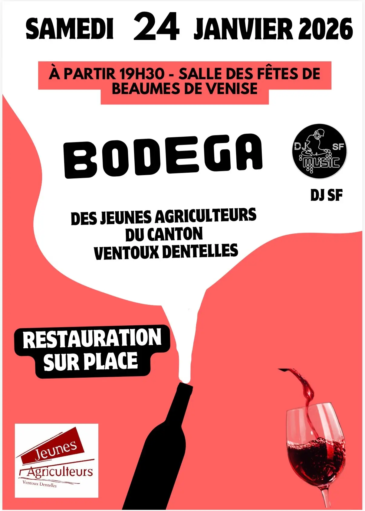 Nous vous attendons nombreux et nombreuses pour notre première édition de la bodéga d’hiver. Les jeunes agriculteurs se feront un plaisir de vous faire passer une agréable soirée animée par DJ SF dans la convivialité et vous surprendre par nos cocktails.