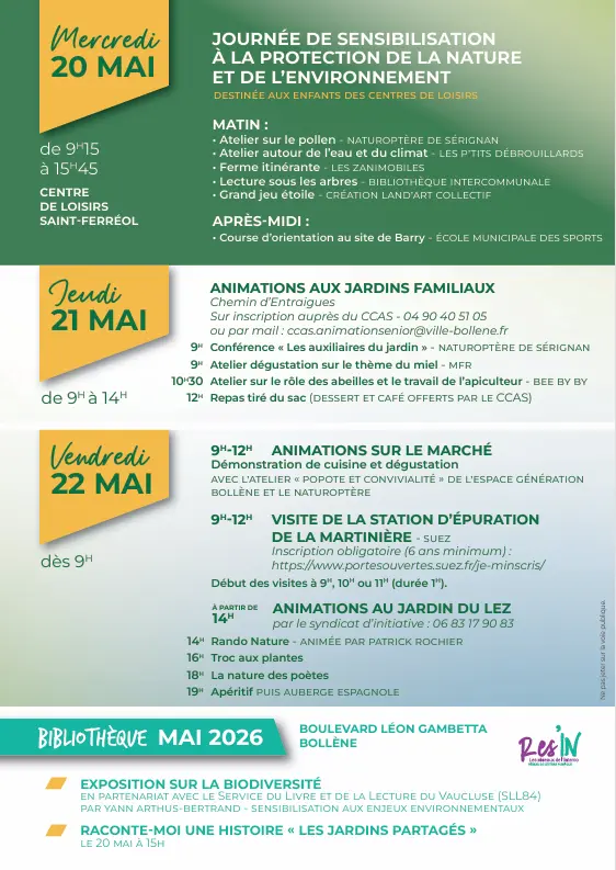 La 3ème édition de « Bollène fête la Nature » se déroulera du 20 au 23 mai, avec un programme riche en activités pour tous les amoureux de la nature et ceux qui n’aspirent qu’à la découvrir.