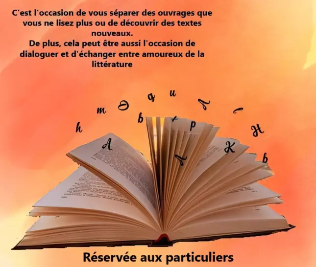 Réservée aux particuliers, cette manifestation est l'occasion de présenter des ouvrages à donner ou échanger ; mais l'échange peut être aussi verbal et aussi magnifier ce support qu'est le livre