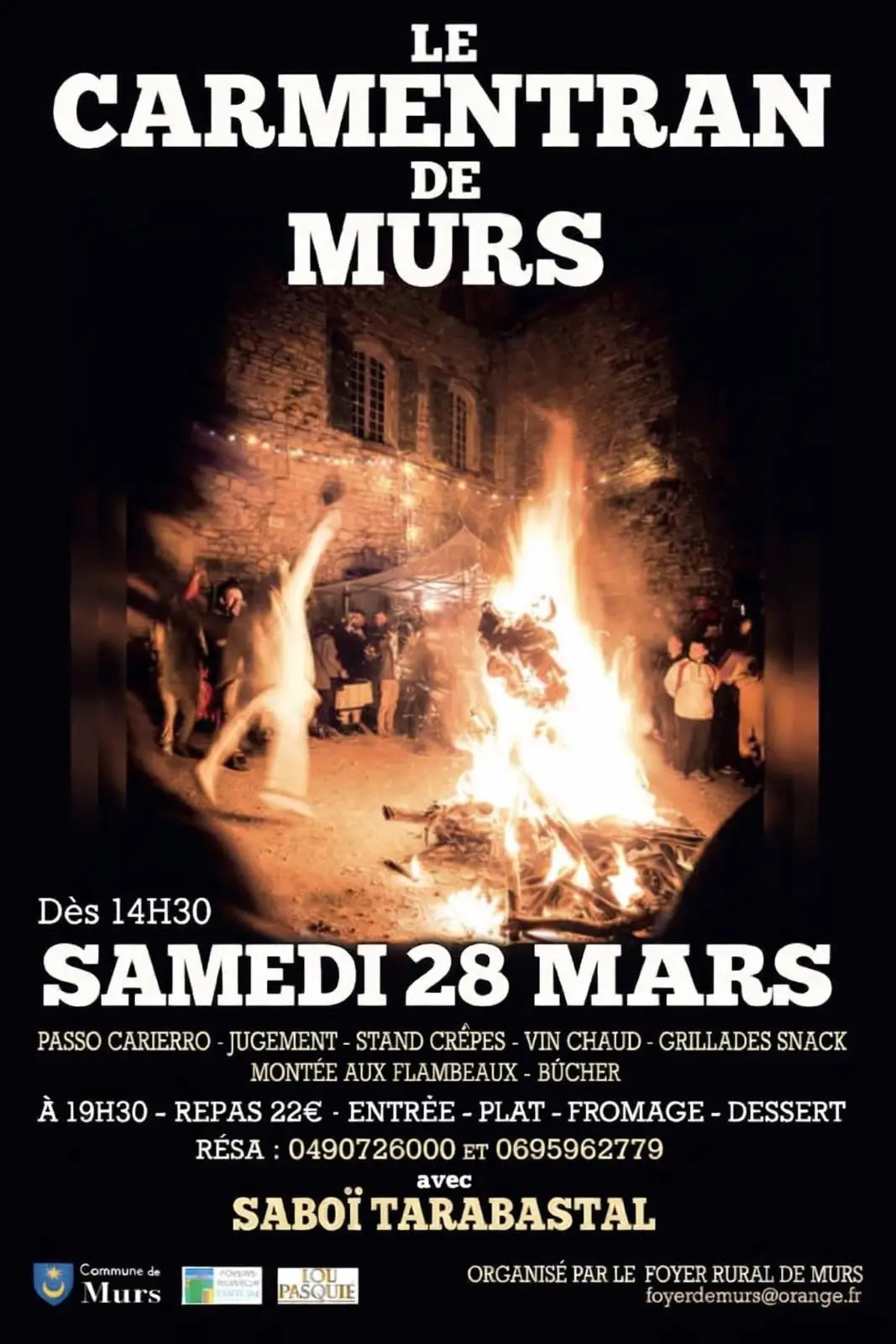 Carmentran de Murs - Carnaval dans le village à partir de 14h. Nous jugerons le bonhomme. Le repas sous chapiteau a toujours lieu pour 22 € par personne (entrée, plat, fromage, dessert) et pour réserver, il faut appeler le 04 90 72 60 00. "Le foyer rural"