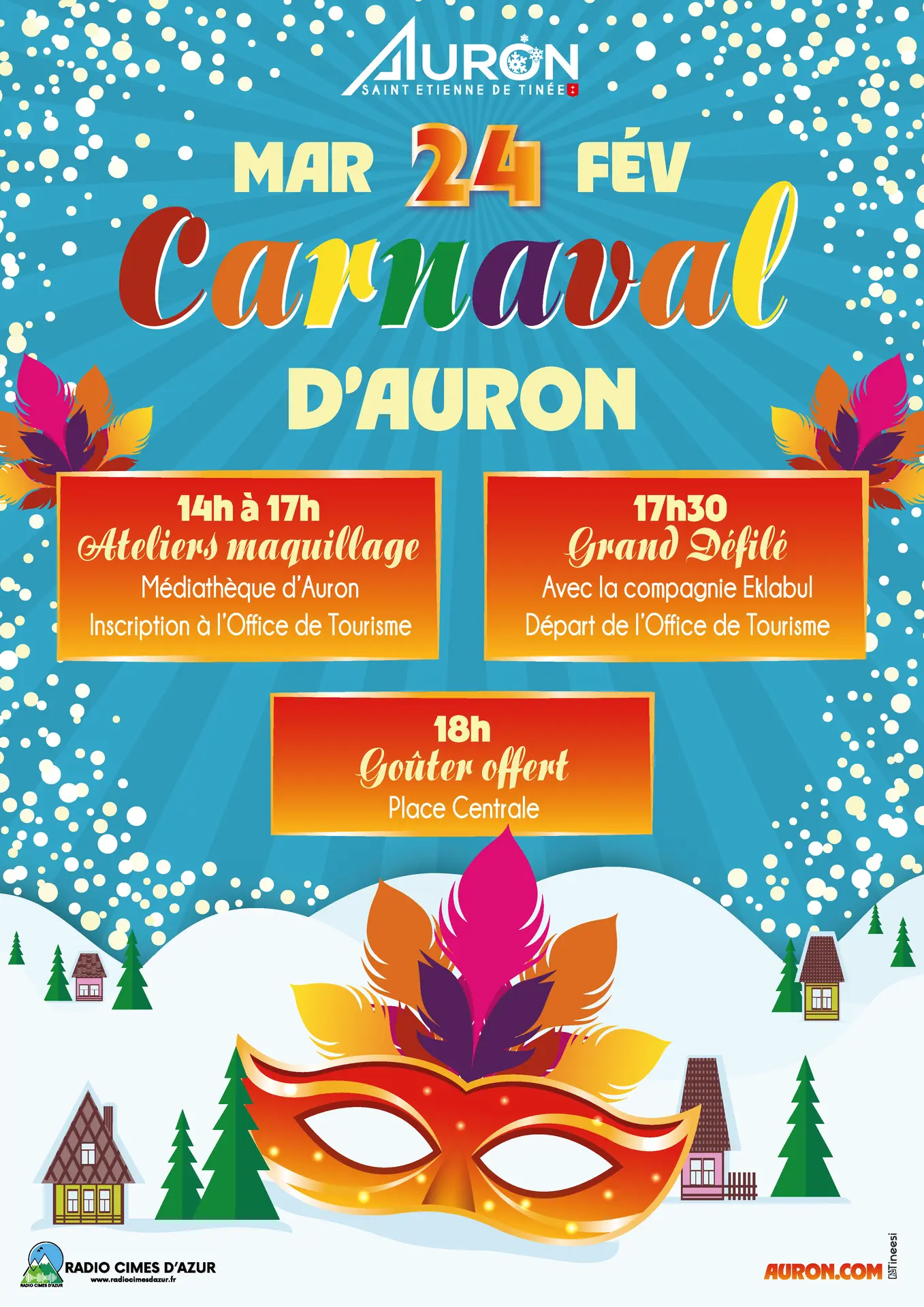 Venez vous faire maquiller à la médiathèque d'Auron avant de défiler dans le village accompagné par la compagnie Eklabul jusqu'à la place centrale où vous pourrez profiter d'un goûter offert !