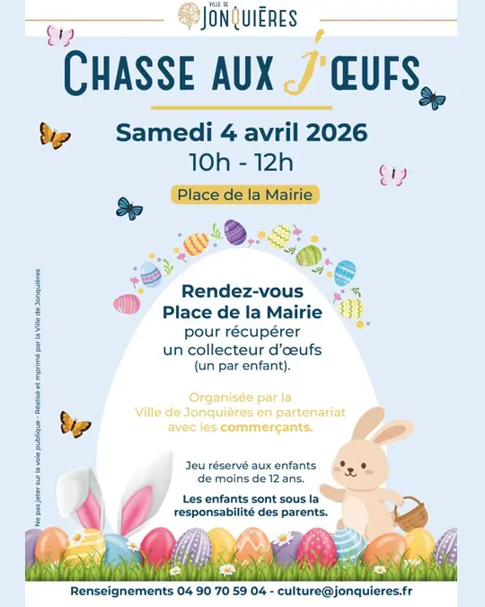 Cette année, la Ville de Jonquières en partenariat avec les commerçants jonquiérois, vous donne rendez-vous sur la place de la Mairie pour la chasse aux œufs!