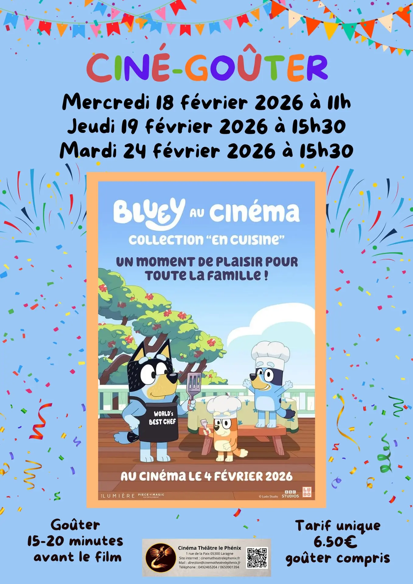 BLUEY au cinéma : collection "en cuisine". Cette compilation rassemble 8 épisodes des trois saisons de la série, tous centrés sur le plaisir de cuisiner. A partir de 3 ans. Goûter 15-20 minutes avant le film.
