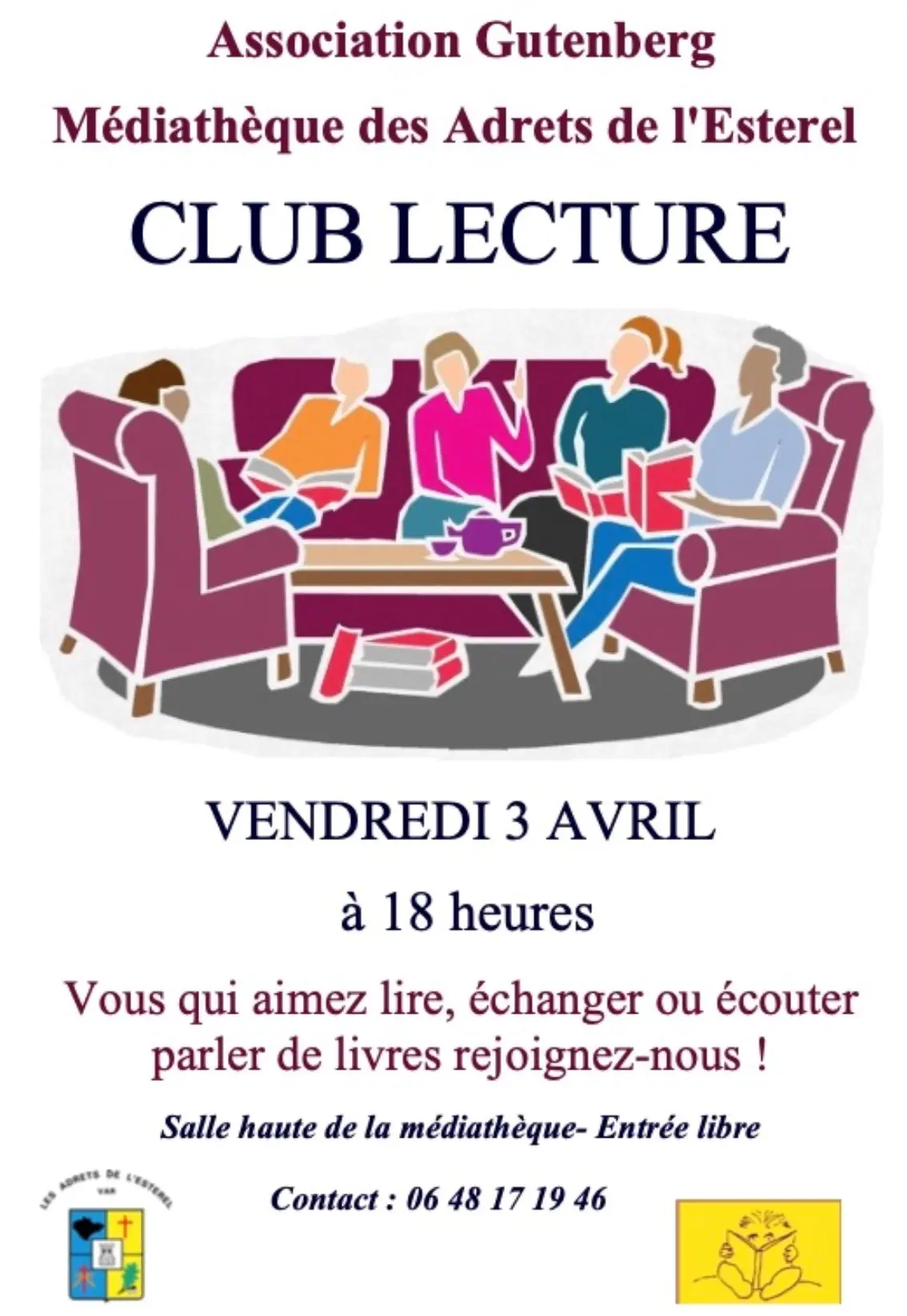 L'association GUTENBERG vous donne rendez-vous le VENDREDI 3 AVRIL à 18h00, à la médiathèque des Adrets pour échanger autour de vos lectures.