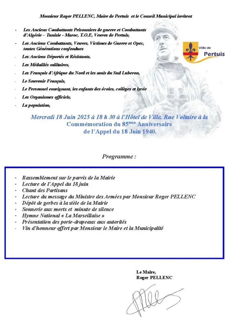Mr Roger PELLENC, Maire de Pertuis et le Conseil Municipal invitent la population le Mercredi 18 juin à 18h30 à l'Hôtel de VIlle pour commémorer l'Appel du 18 juin 1940.