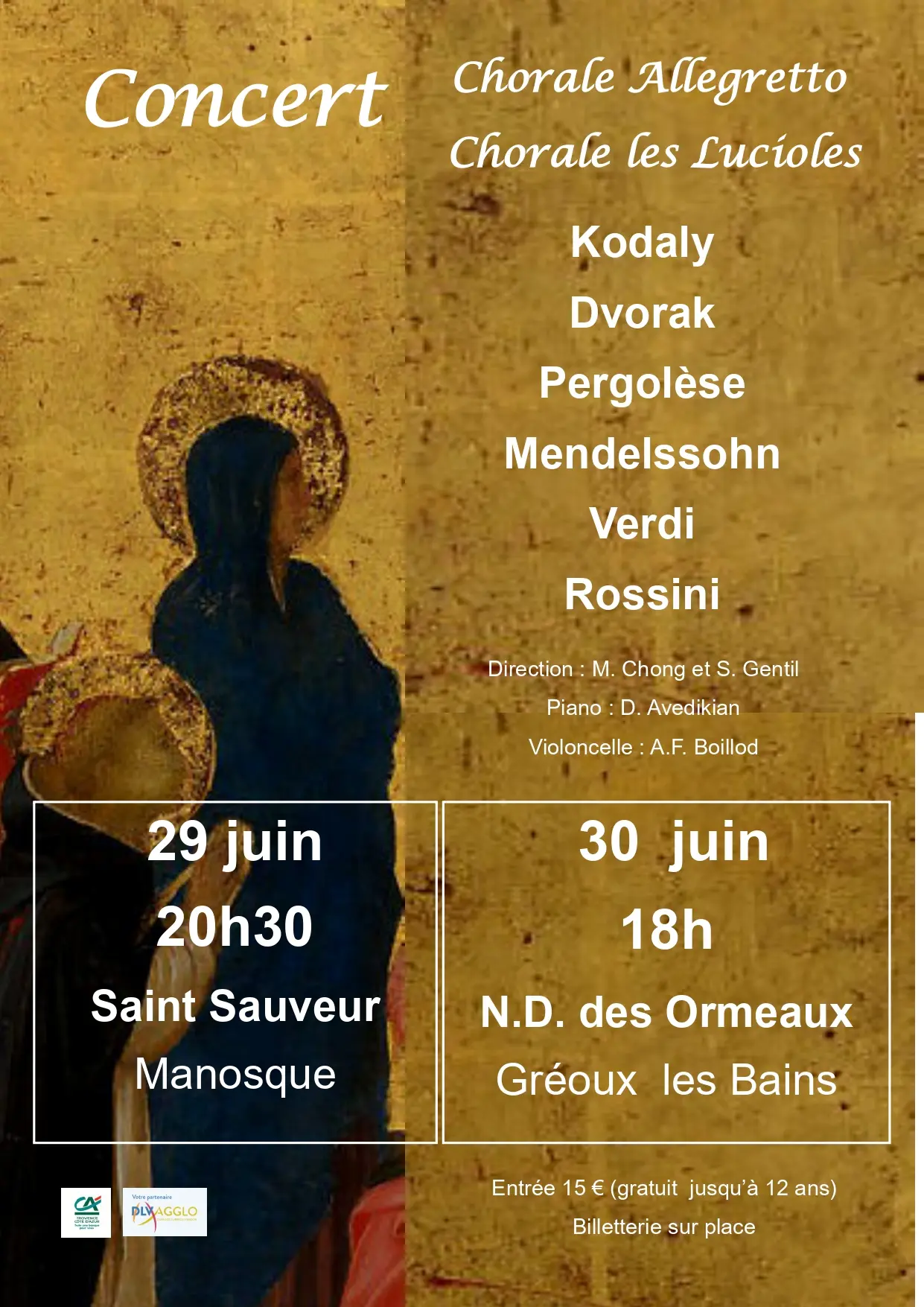 Extraits de Stabat Mater : Kodaly, Dvorak, Pergolèse. Ave Maria de Mendelssohn, chœurs de Verdi et Rossini, pièces solo et duo de chanteurs, pièces instrumentales (piano, violoncelle).