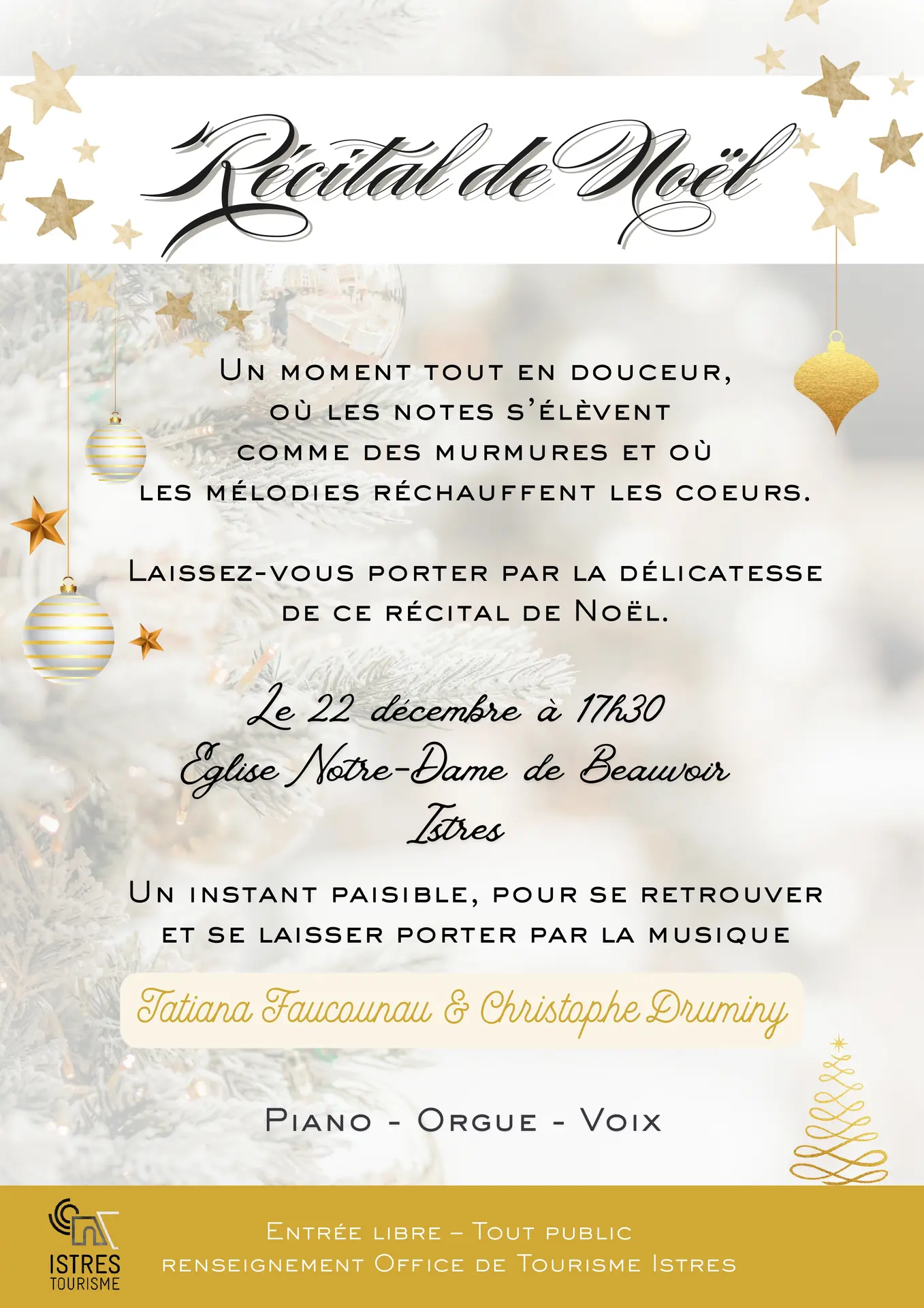 Tatiana Faucounau, chanteuse lyrique et Christophe Druminy, à l’orgue et au piano, vous donnent rendez-vous à l’église Notre Dame De Beauvoir pour un concert de Noël exceptionnel !