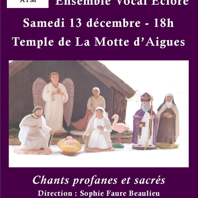 L'ensemble vocal ECLORE sera très heureux d'interpréter pour vous un court programme alternativement joyeux et recueilli. Chants sacrés et profanes seront le prétexte d'exploration de toute une palette d'harmonies dont nous espérons qu'elles vous touchent et vous emmènent, l'espace d'un concert, dans un monde vibrant et apaisant.