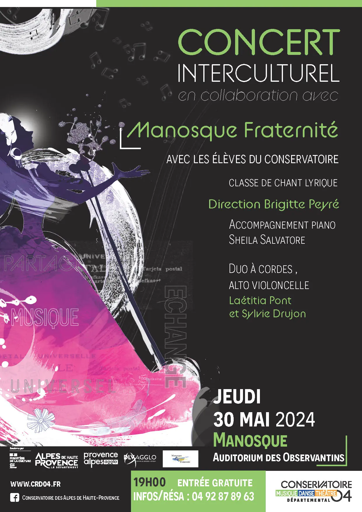 Concert réunissant des œuvres illustrant les différentes religions. Organisé à la demande de "Manosque fraternité" avec les élèves et professeurs du conservatoire.
