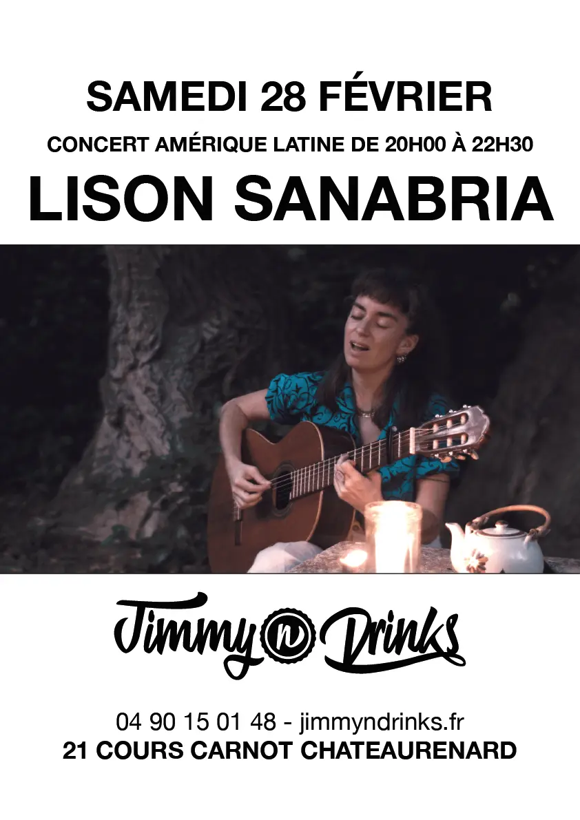 Venez assister au concert de "Lison Sanabria" chez Jimmy n Drinks tout en buvant un verre, dégustant un plat... Concert musiques d'Amérique Latine.