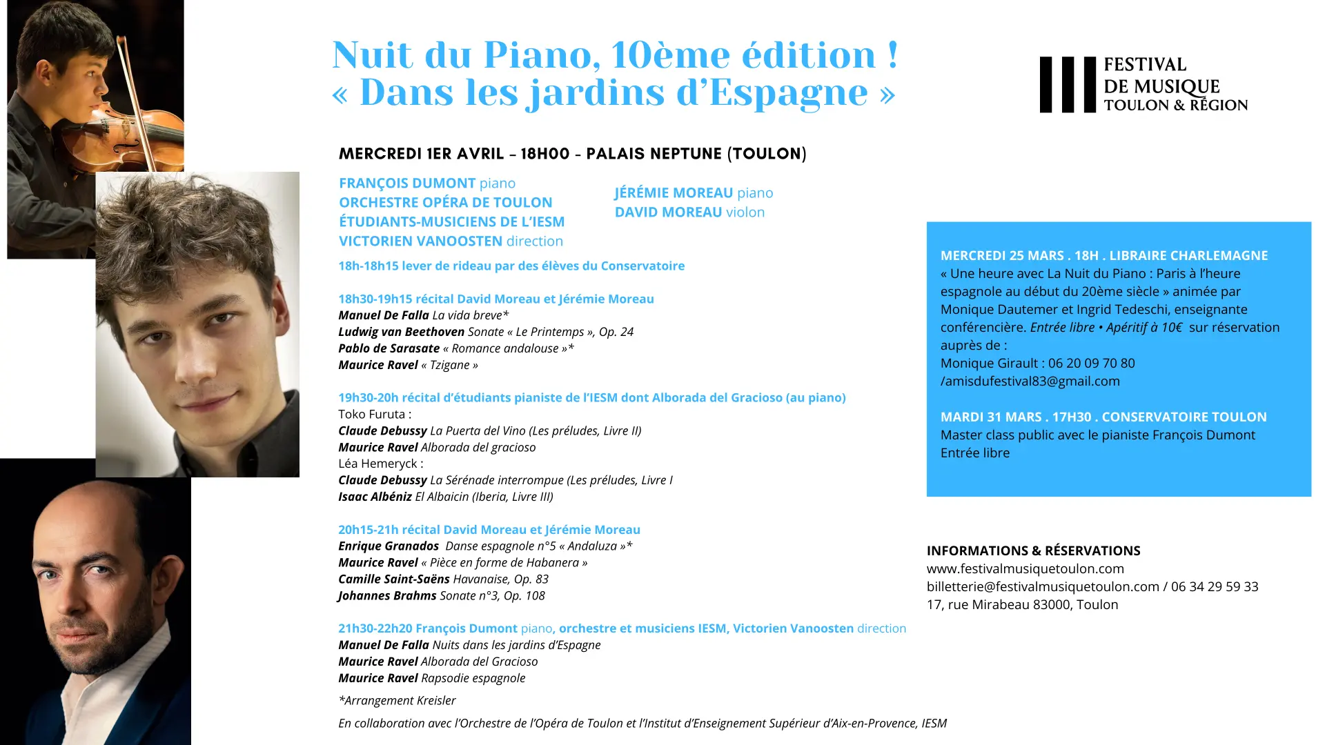 Avec François Dumont (piano), l'Orchestre de l'Opéra de Toulon (direction Victorien Vanoosten), les étudiants-musiciens de l'IESM, David Moreau (violon) et Jérémie Moreau (piano).