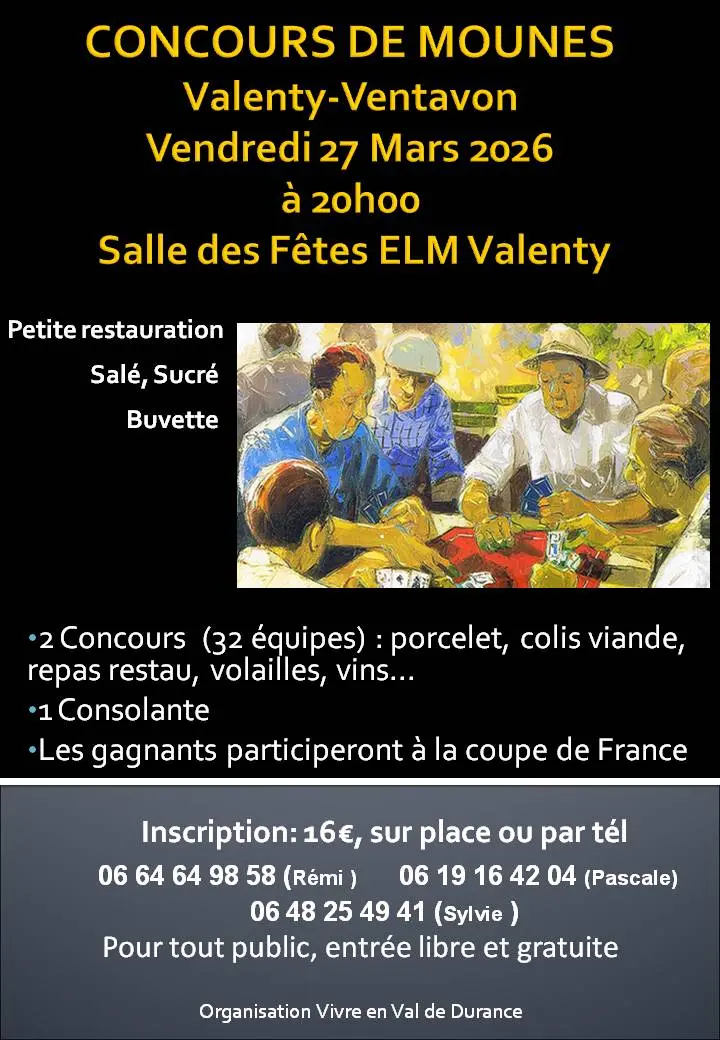 2 concours (32 équipes) : porcelet, colis de viande, repas au restaurant, volailles, vins... 1 consolante. Les gagnants participeront à la Coupe de France. Petite restauration (salé, sucré), buvette. Pour tout public, entrée libre et gratuite.