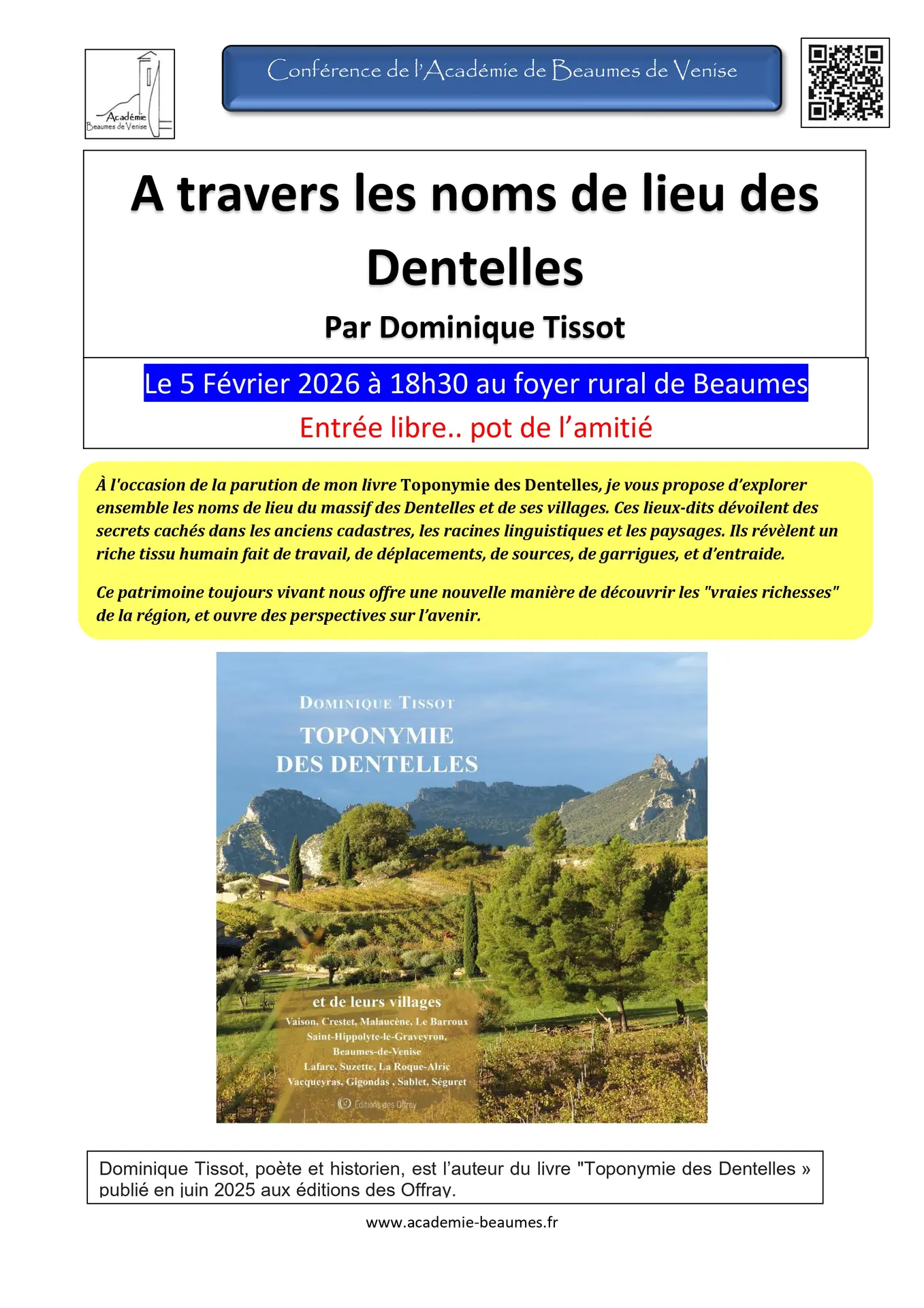 A l'occasion de la parution de son livre "Toponyme des Dentelles", Dominique Tissot explore les noms de lieux du massif des Dentelles et de ses villages perchés. Un pot de l'amitié clora la conférence.