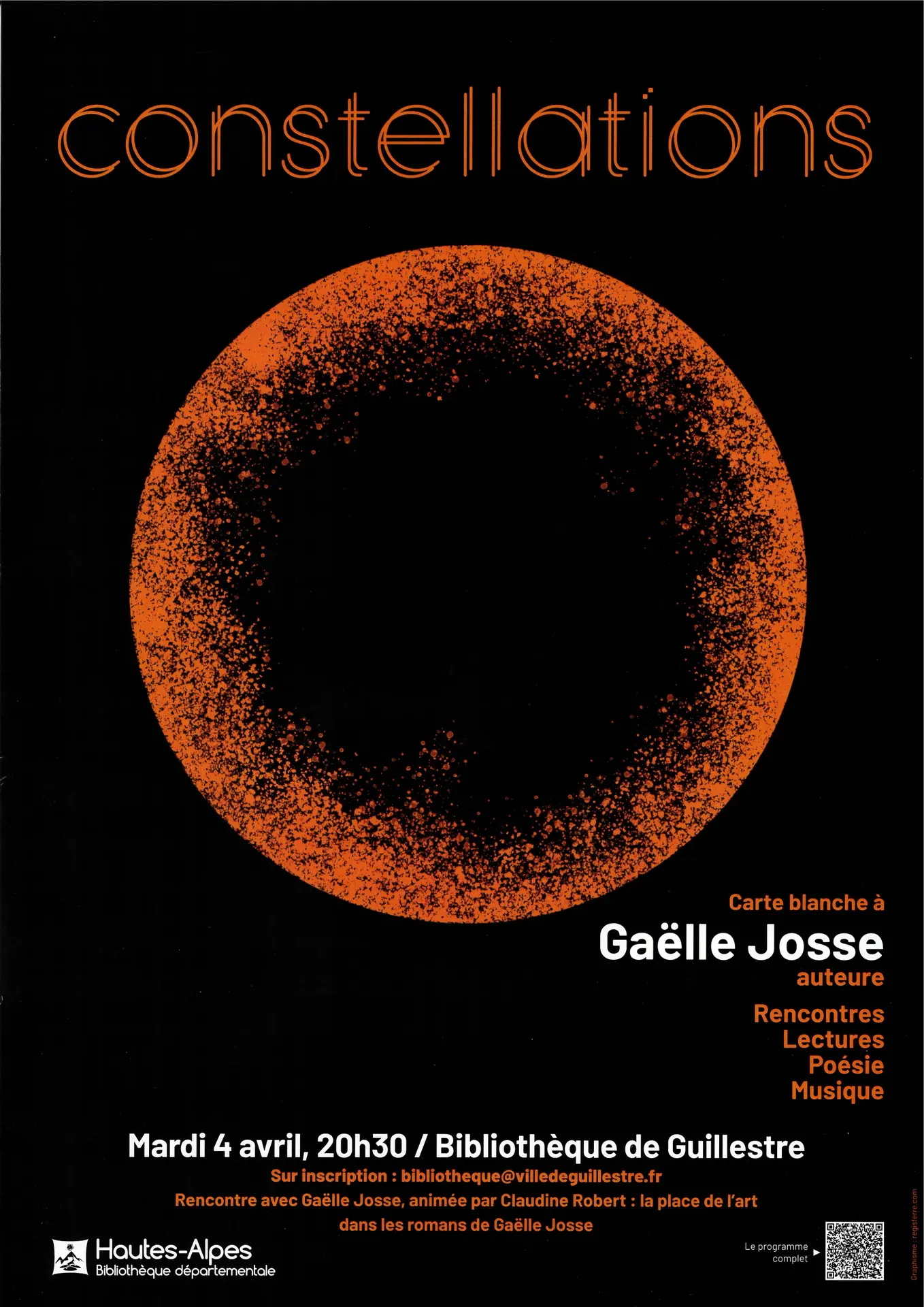 Tu rêves secrètement, dans les constellations de tes songes, d'une rencontre avec Gaëlle Josse ? La bibliothèque l'a fait ! Animée par Claudine Robert cette rencontre est l'occasion d'évoquer la place de l'art dans les romans de l'auteur.