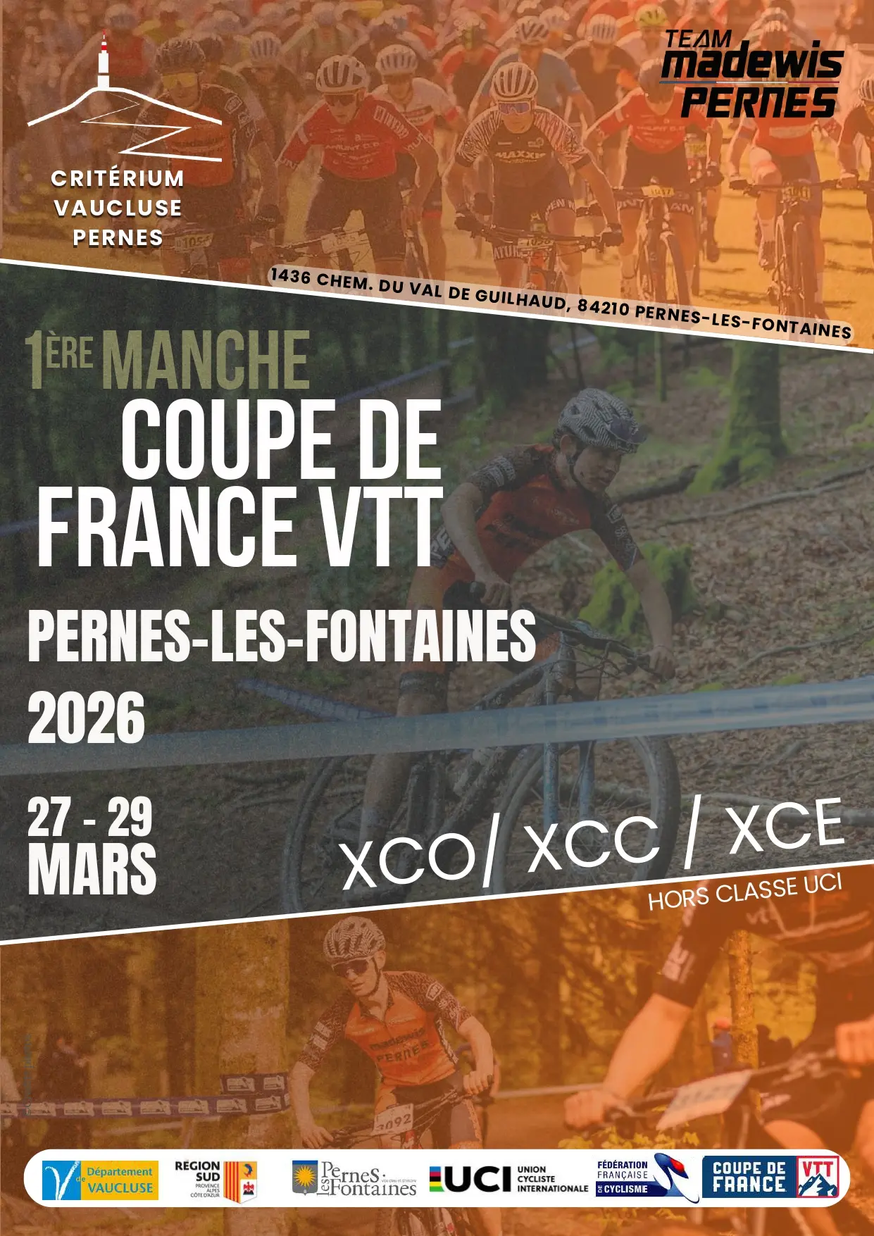 Il s’agira d’une compétition de niveau national et international de VTT, organisée par le CRITÉRIUM VAUCLUSE PERNES. C’est la première manche du calendrier national de la COUPE DE FRANCE VTT sous l’égide de la FÉDÉRATION FRANÇAISE DE CYCLISME et de l’UNION CYCLISTE INTERNATIONALE (pour rappel en 2009 et en 2010, le club avait déjà organisé la manche d’ouverture). Il y a 5 manches au calendrier national et nous serons donc l’ouverture du calendrier du 27 au 29 mars, avec 3 journées de compétitions.