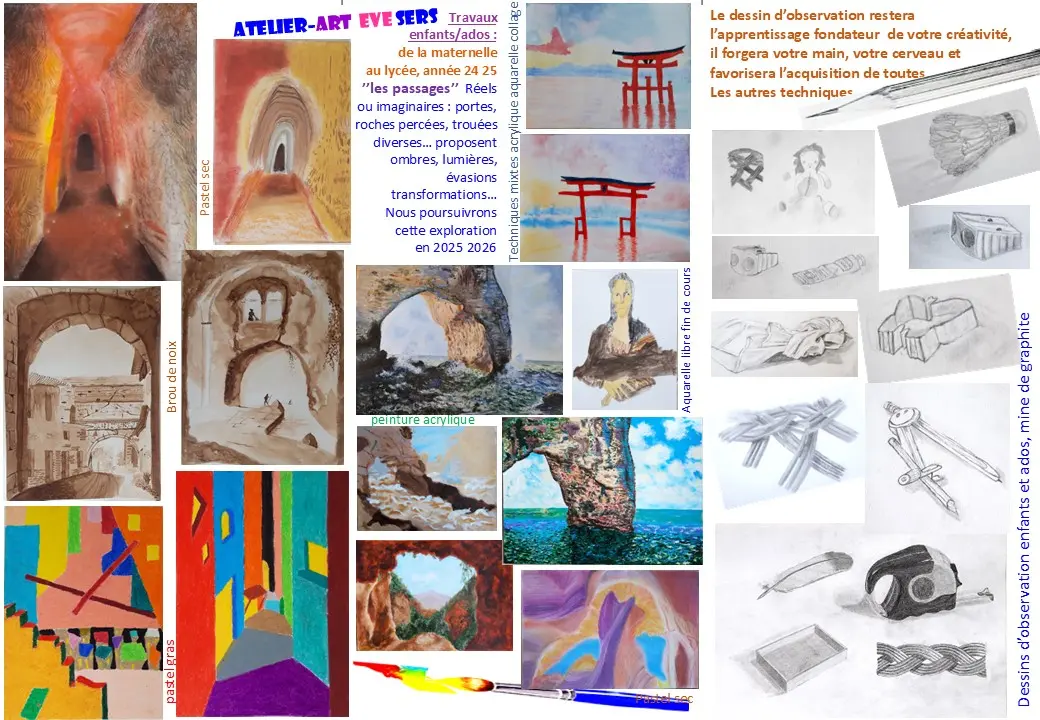Les cours s'adressent aux enfants et adolescents, les bases du dessin d'observation sont enseignées systématiquement, les différentes techniques sont abordées tout au long de l'année ( pastel, sanguine, aquarelle, peinture acrylique, encres, collages, techniques mixtes ...) pour que chacun s'approprie le mode d'expression qui lui convient. Les adultes peuvent choisir leurs techniques, ils seront soutenus dans leur apprentissage ou leur évolution. Un thème guide toutes les recherches, il n'est pas imposé aux adultes. L'enseignement est très individualisé et adapté à personnalité des élèves.