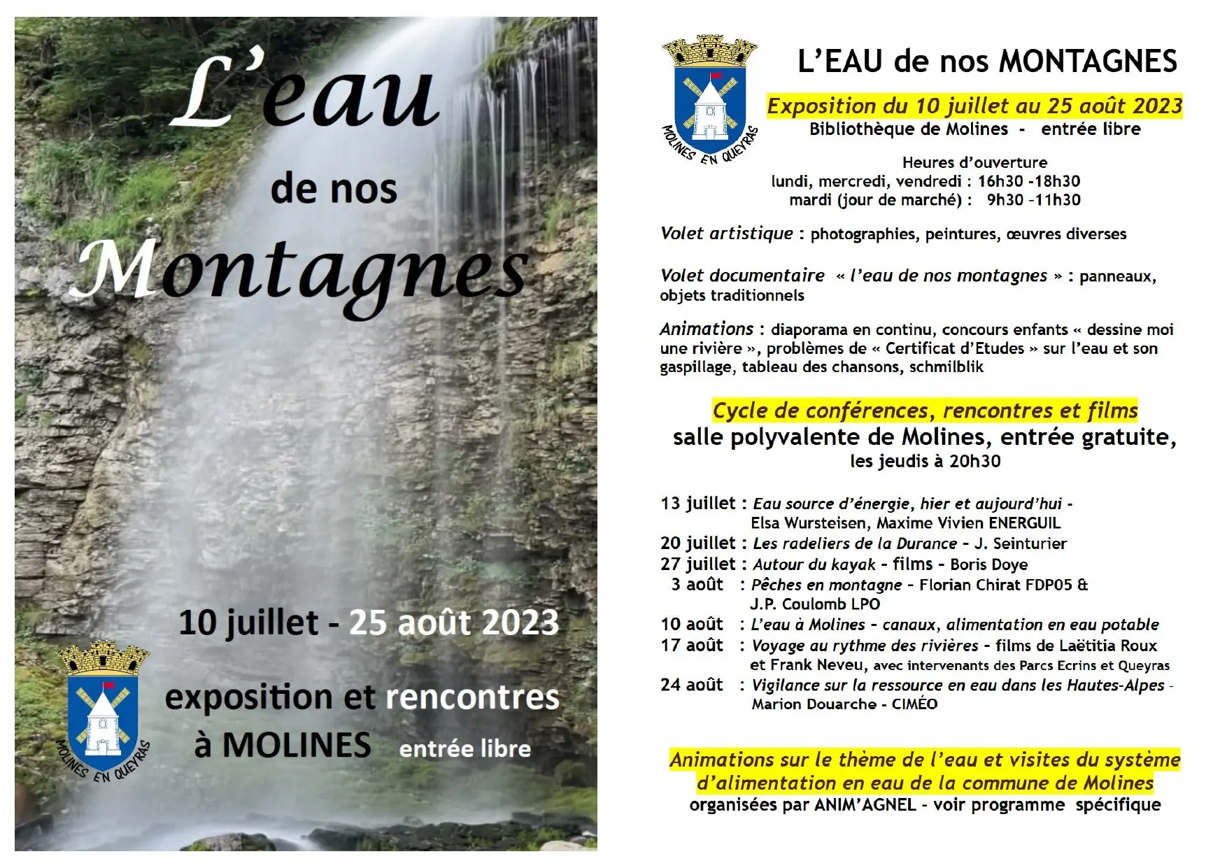 Un cycle de conférences et des films sont proposés en parallèle de l'exposition "L'eau de nos montagnes"