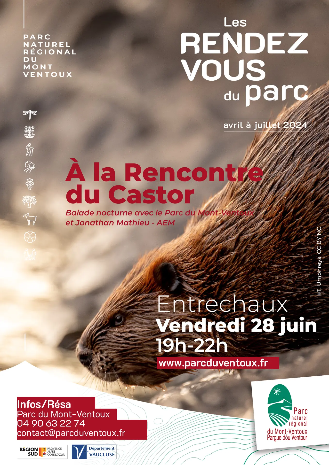 Patientons jusqu’au crépuscule pour rencontrer le castor d’Europe. Des traces, il en laisse, l’animal est facile à repérer ! Rdv sur les bords de l’Ouvèze. À la fin de la balade, un affût sera organisé pour peut-être l'apercevoir. Infos 04 90 63 22 74