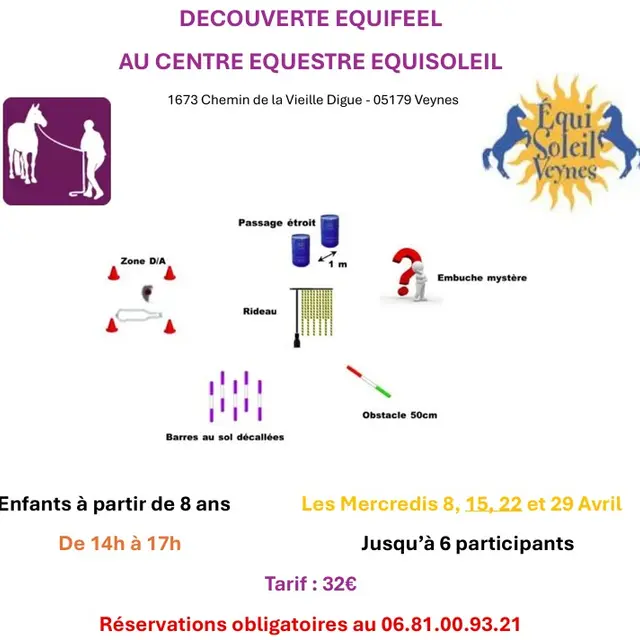 Descriptif : L’Equifeel est une discipline équestre qui se pratique à pied. Ludique, elle développe la complicité et la compréhension dans les interactions cavaliers-cheval/poney afin d’évoluer dans les niveaux de difficultés des dispositifs. Cela permet au cavalier de réfléchir, analyser et choisir, en fonction de son ressenti avec son partenaire équin.