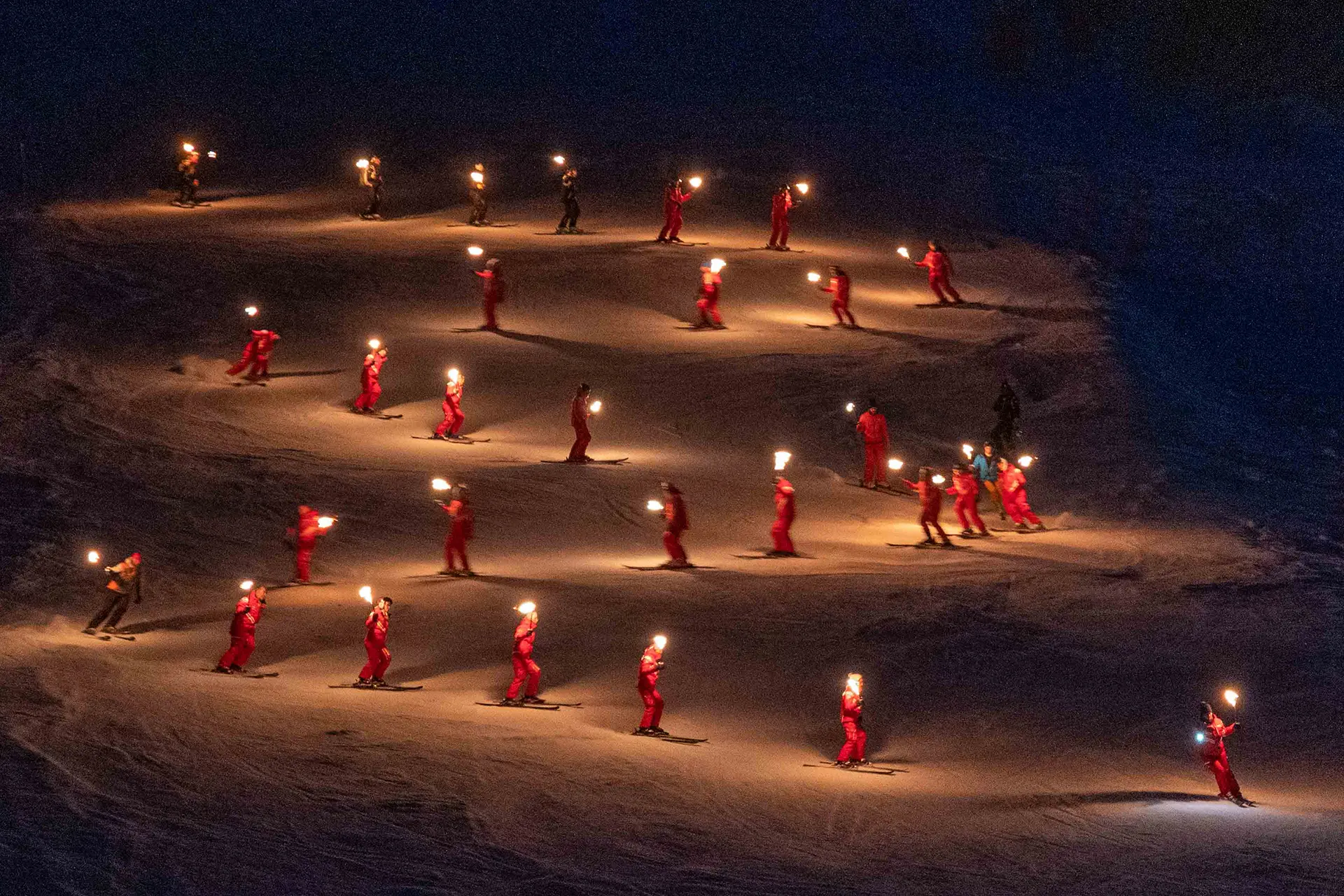 La lumière danse, la neige scintille, vibrez au rythme de la descente aux flambeaux des moniteurs ESF/ESI et de la régie Ubaye Ski.