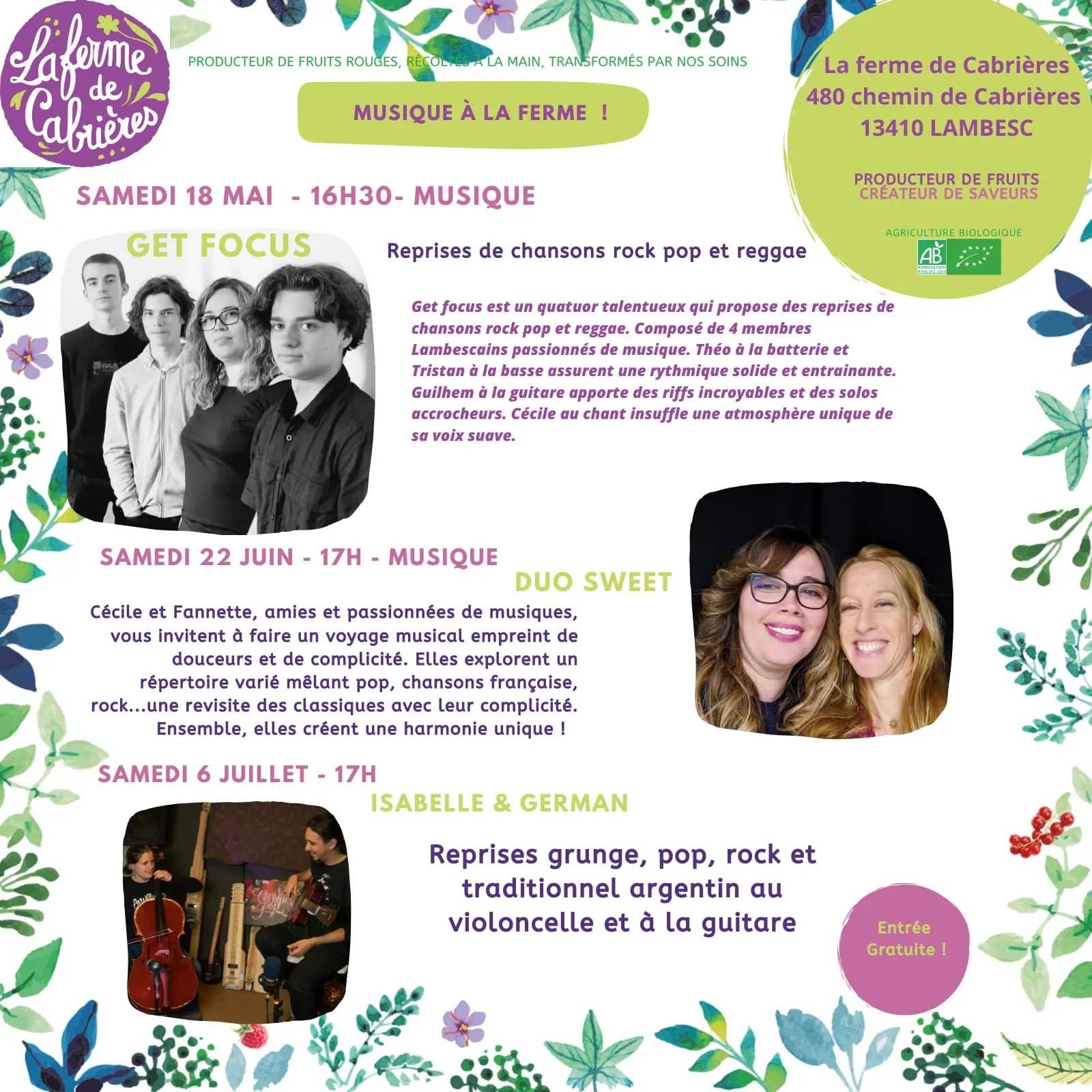 Cécile et Fannette, amies et passionnées de musiques, vous invitent à faire un voyage musical empreint de douceur et de complicité, dans le cadre verdoyant de la Ferme de Cabrières.