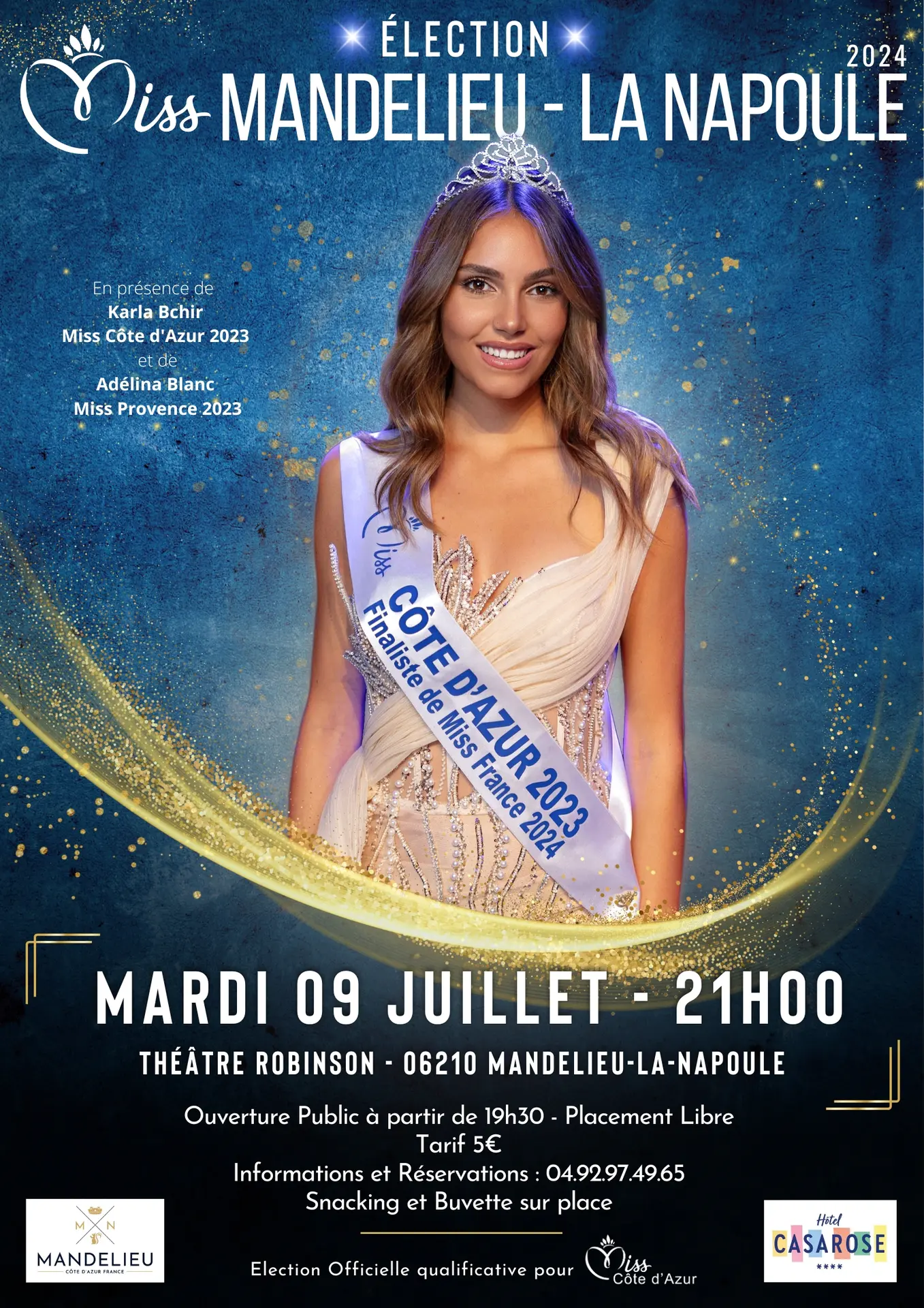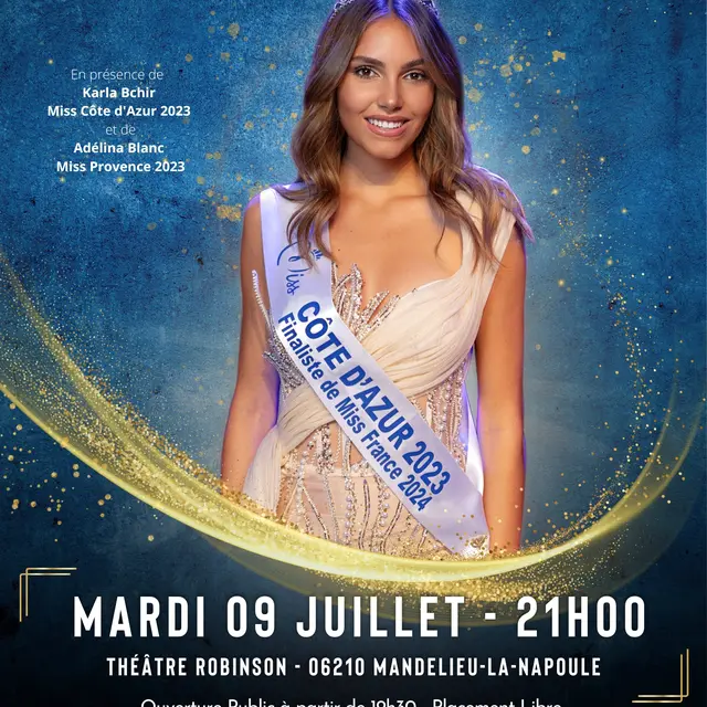 Assistez au sacre de Miss Mandelieu-La Napoule 2024 en présence de Karla Bchir, Miss Côte d'Azur 2023 et de Adélina Blanc, Miss Provence 2023. Election officielle qualificative pour Miss Côte d'Azur.