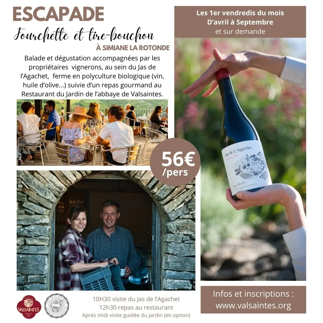 Le Jas de l’Agachet et le Jardin de l’abbaye de Valsaintes à Simiane la rotonde s’associent pour vous proposer une journée gourmande à passer entre amis, entre collègues ou en famille. Visite et dégustation sur le domaine et repas à Valsaintes.