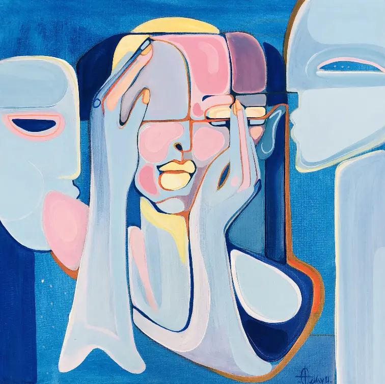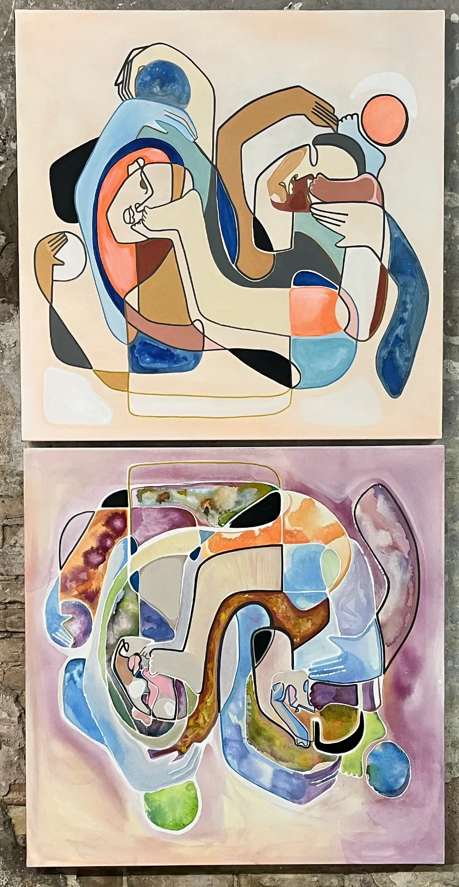 Mes personnages semblent parfois encore à mi chemin entre les contrariétés de la réalité et un royaume de sérénité intérieure. Dans ces toiles j’aimerais mettre en avant_ « le droit aux doutes; le choix du bonheur »comme si l’on pouvait s’extraire du manichéisme ambiant pour expérimenter les nuances des couleurs de nos vies.