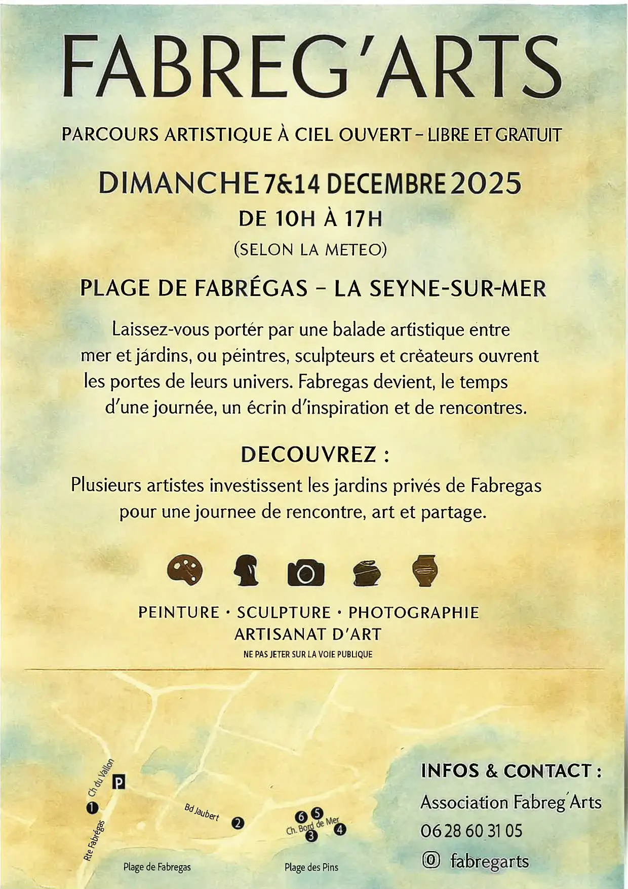 Laissez - vous porter par une balade artistique entre mer et jardins, ou peintres, sculpteurs et créateurs ouvrent les portes de leurs univers. Fabrégas devient, le temps d'une journée, un écrin d'inspiration et de rencontres.
