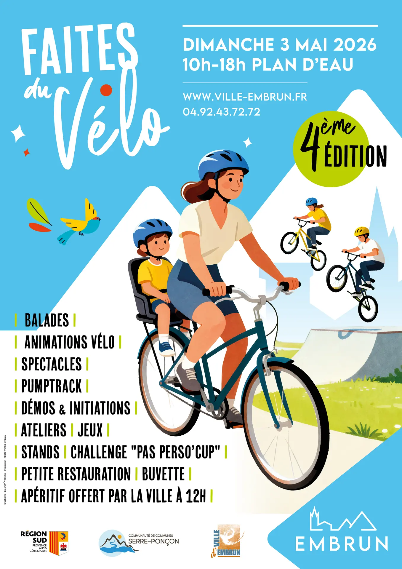 Organisation Ville d'Embrun, avec la participation de Roule Pas Perso, Alpes 2 Roues, Remcycles, Vel'Eau Serre-Ponçon, Communauté de Communes de Serre-Ponçon, préférecture des Hautes-Alpes, Association des Parents d'élèves de l'Ecole Pasteur "Les Mordus de Pasteurs".
