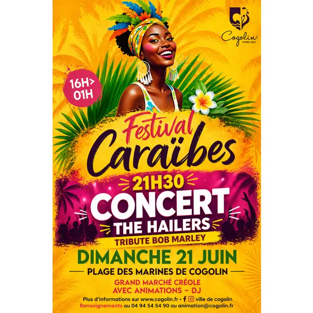 Le festival Caraïbes propose un grand marché créole avec animations et DJ, suivi d'un concert de The Hailers à 21h30, un groupe hommage à Bob Marley.