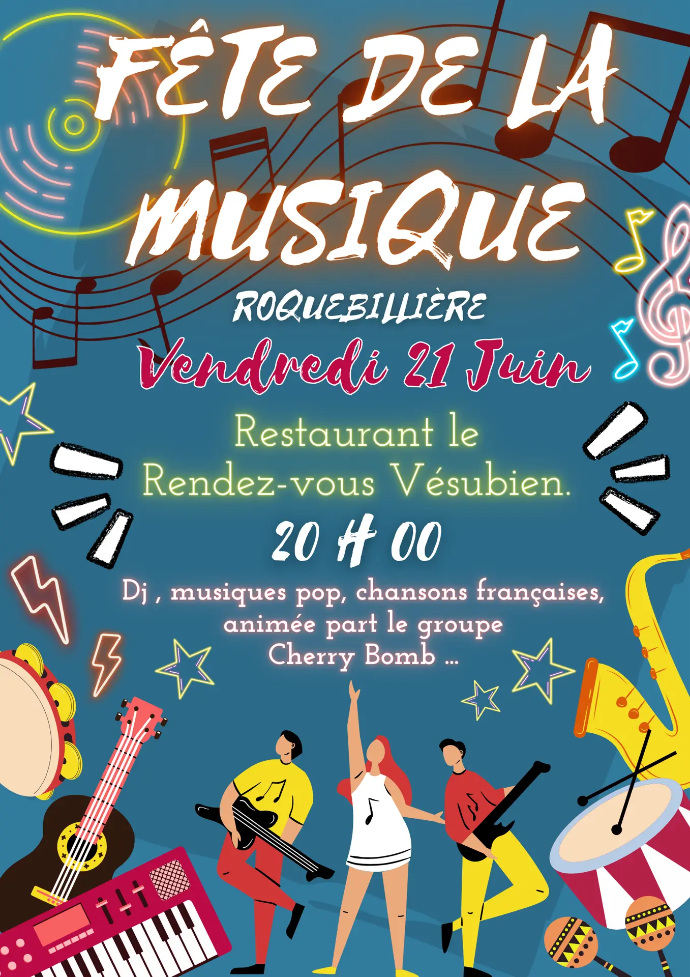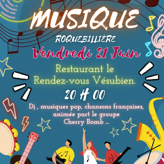 Pour une Fête de la Musique 2024 autant musicale que gourmande, le restaurant "le Rendez-vous" reçoit le groupe Cherry Bomb avec leurs musiques pop et leurs chansons françaises.