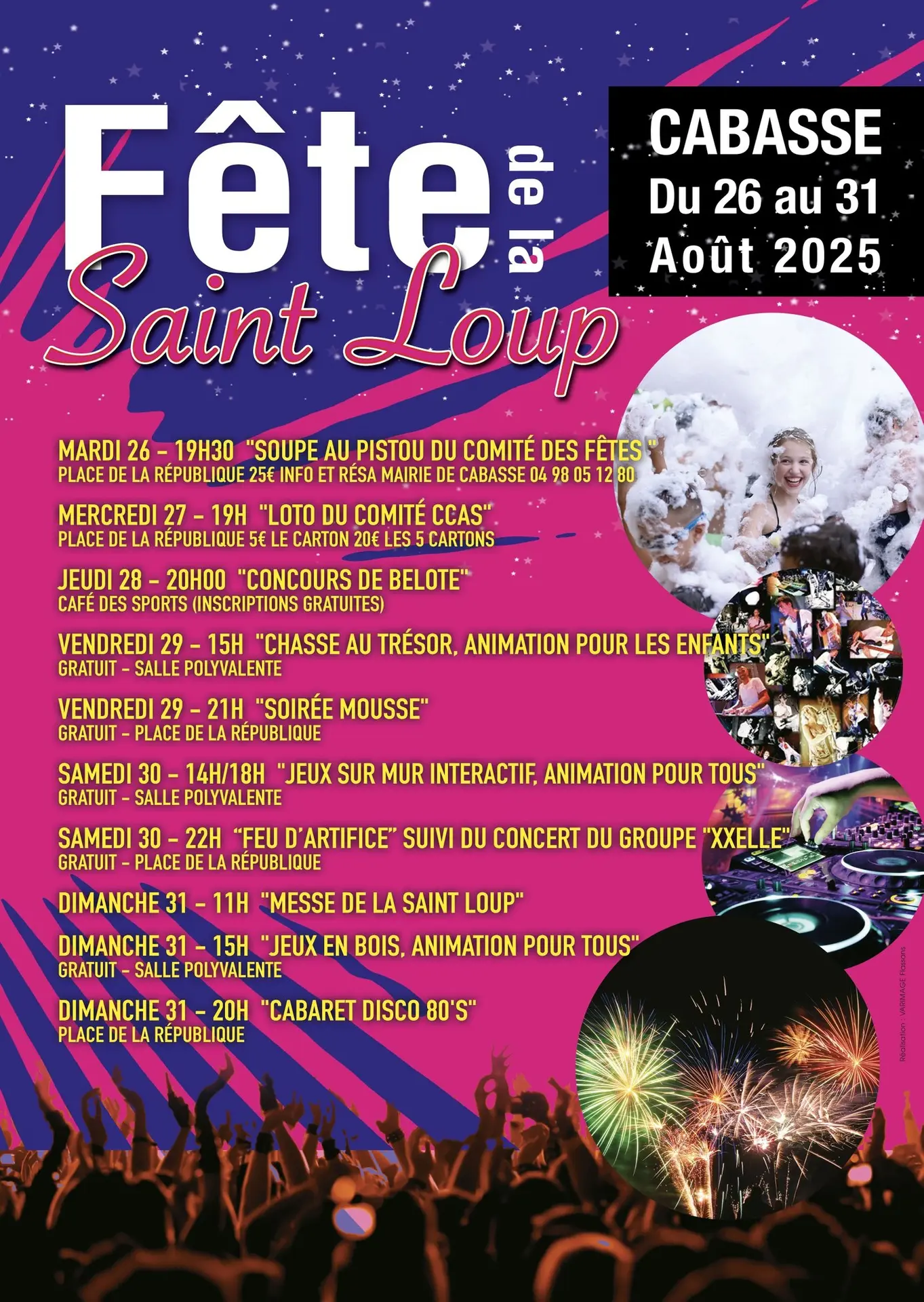 Fête locale. Spectacle, soirées dansantes, concert, feu d'artifice.