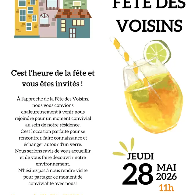 À l'approche de la Fête des Voisins, nous vous convions chaleureusement à venir nous rejoindre pour un moment convivial au sein de notre résidence.