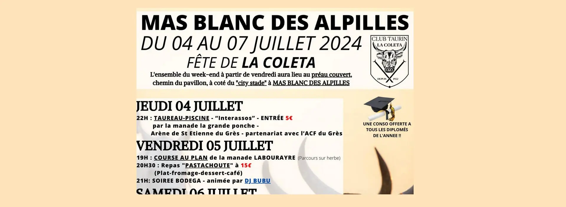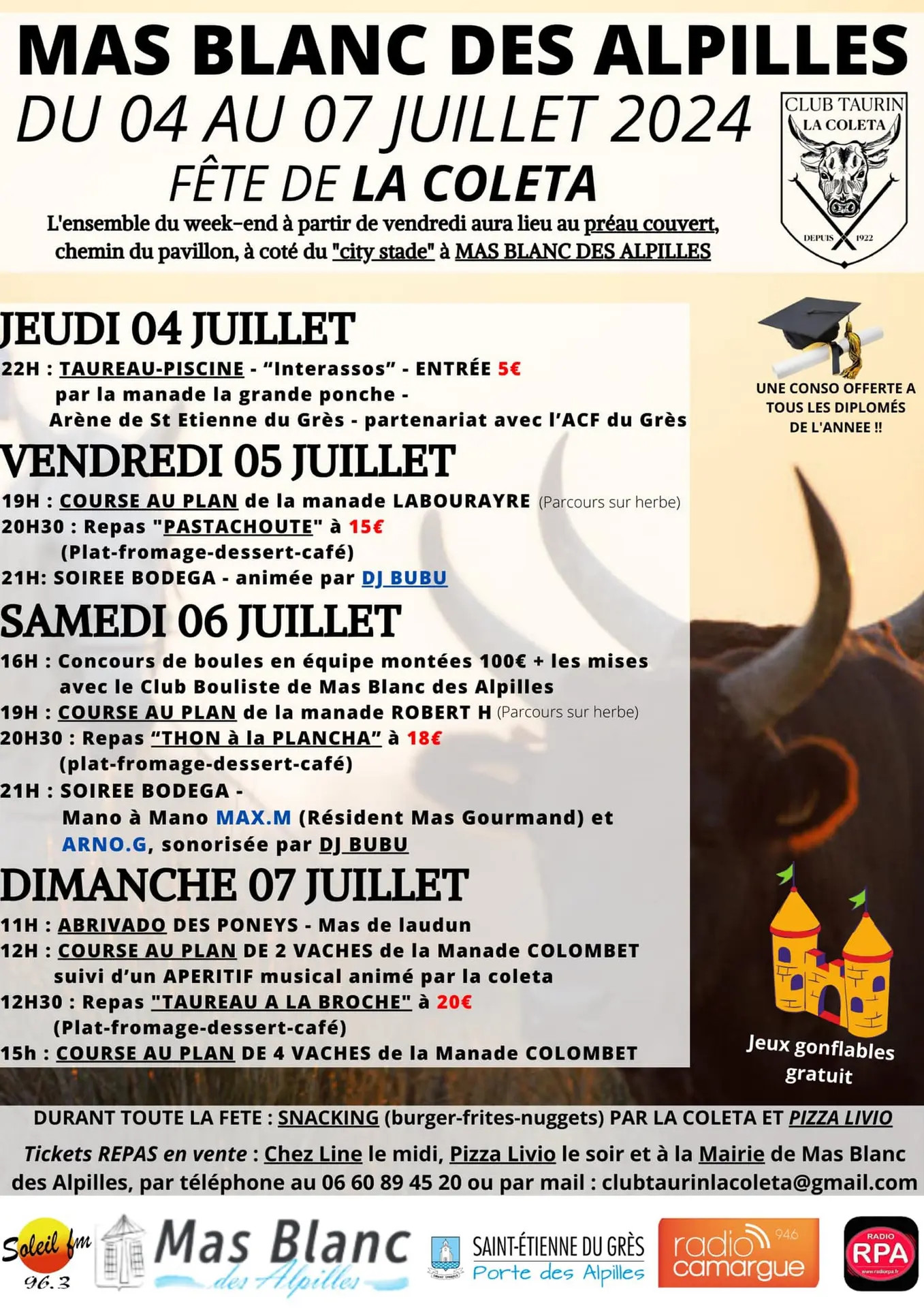 Venez nous rejoindre comme toujours dans un esprit familial et festif ! Taureaux, vaches, apéros, pétanques, repas, snacking, bodega ! Avec le grand retour des taureaux piscine dans les arènes de St Etienne du Grès ! À vos agendas