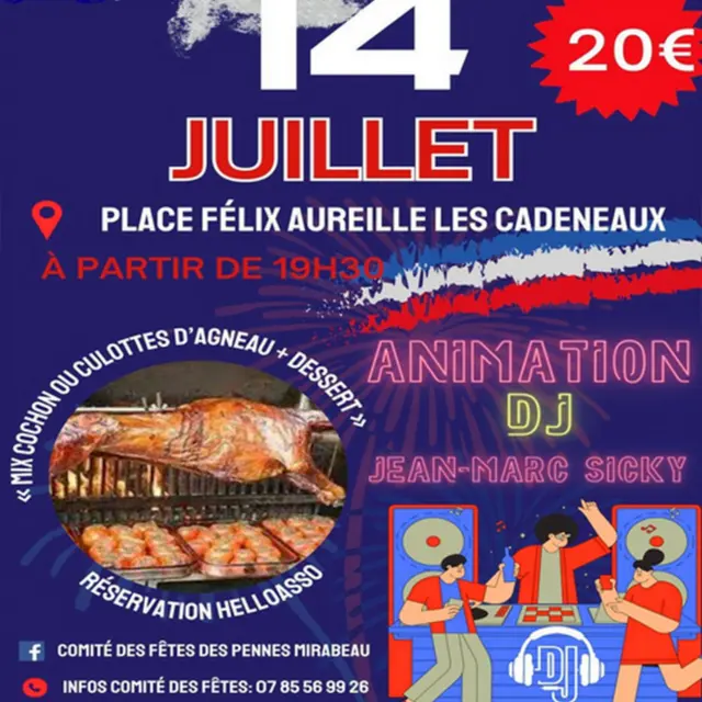 Repas proposé par le Comité des Fêtes et animé par DJ Jean-Marc Sicky, le 14 Juillet, place Félix Aureille (Les Cadeneaux)