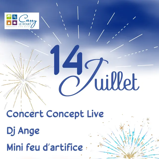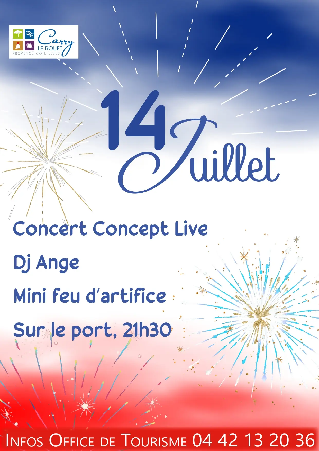 A partir de 21h00 spectacle concept live(musiciens+ DJ), feu d’artifice à 22h00 et ensuite DJ jusqu’à minuit et demi.
