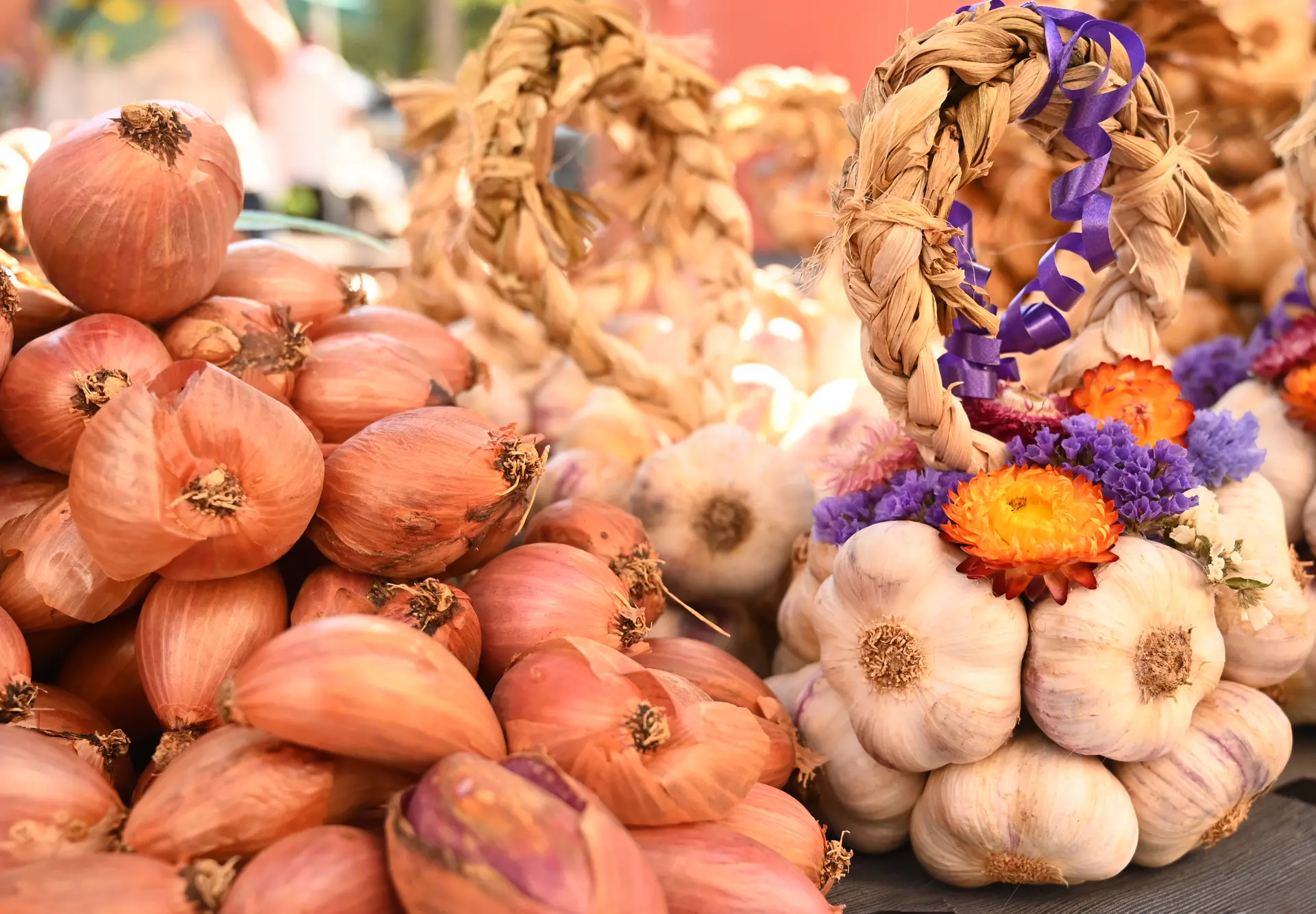 Découvrez les stands où trônent tresses d’ail, oignons et boudins mais également produits locaux et régionaux, artisanat, vin…