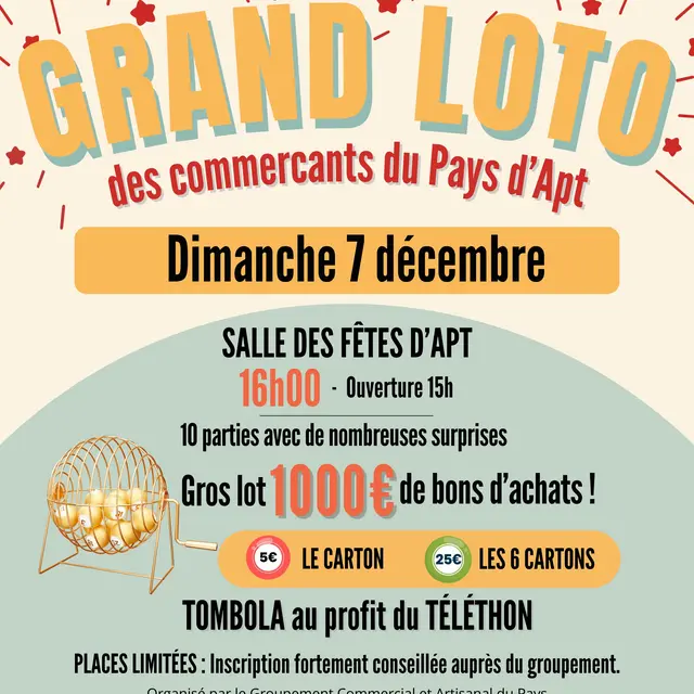 Le Groupement Commercial du Pays d’Apt organise un grand loto exceptionnel le 7 décembre à 16h (ouverture des portes dès 15h).
