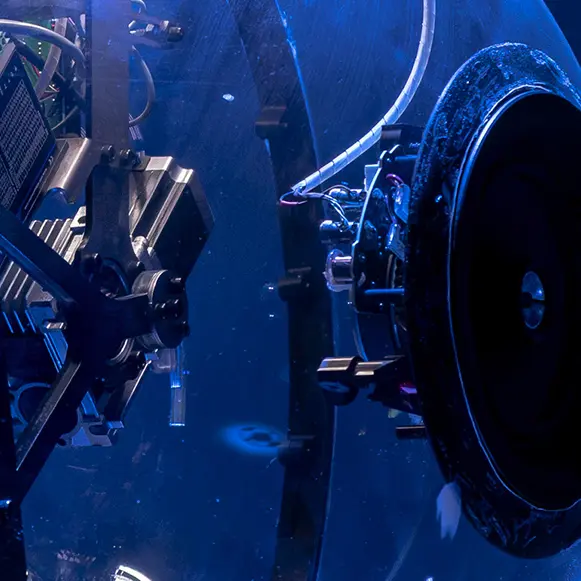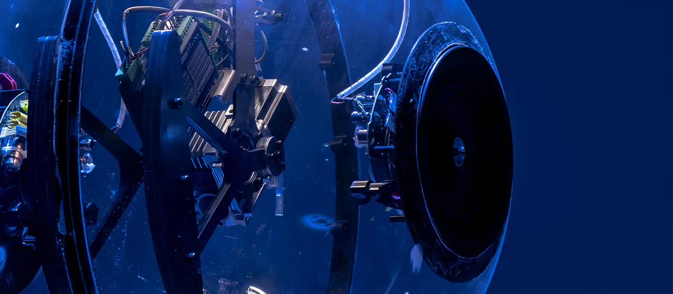 Dans la pesanteur, les grandes sphères apparaissent avec l’étrangeté d’une robotique animale engageant nos perceptions physiques et émotionnelles. Leurs comportements hypnotiques ouvrent sur les paradoxes du fini et de l’infini, ainsi que sur la dualité onde-corpuscule.