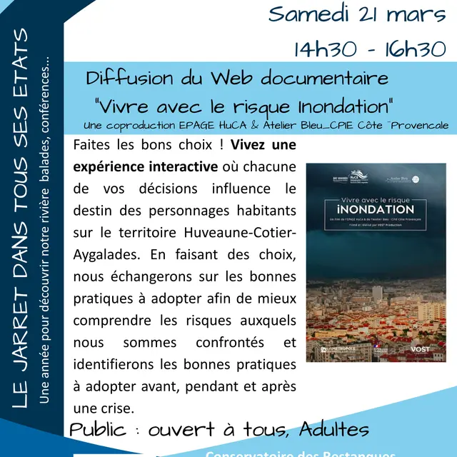 Diffusion du Web documentaire "Vivre avec le risque inondation" - Une co production EPAGE HuCA & Atelier Bleu - CPIE Côte Provençale. Faites les bons choix ! Vivez une expérience interactive où chacune de vos décisions influence le destin des personnages habitants sur le territoire Huveaune-Cotier-Aygalades.
