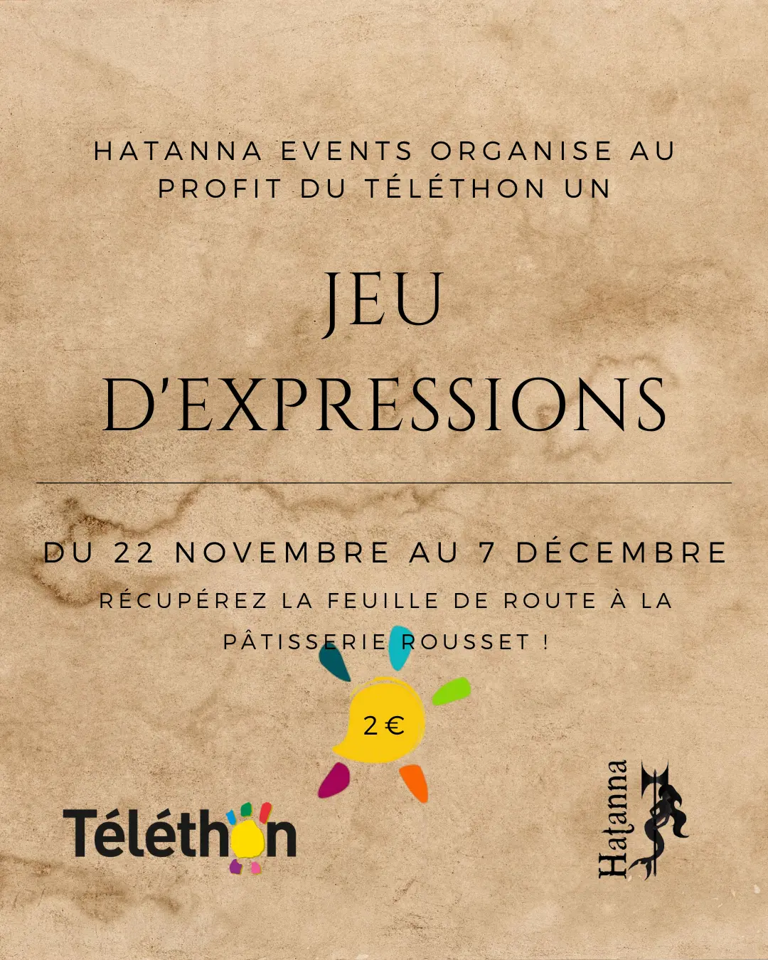 Rendez-vous du 22 novembre au 7 décembre dans les rues d'Apt afin de retrouver les énigmes d'Hatanna ! Le jeu portera sur les expressions françaises. La feuille de route vous attend à la pâtisserie Rousset. 2€/feuille de route.