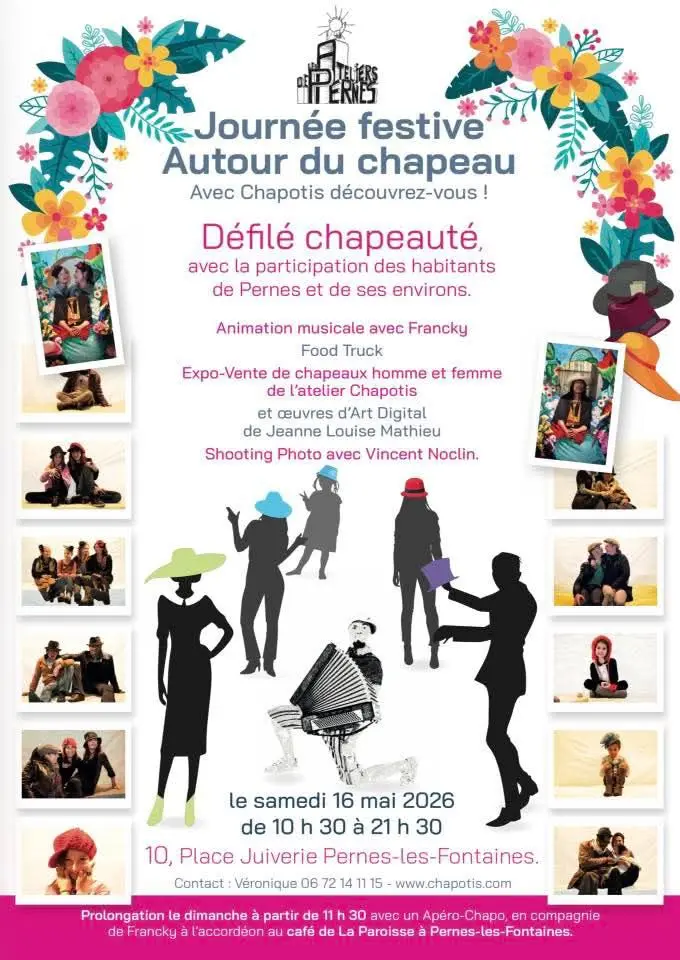 Samedi 16 mai de 10h30 à 21h30, défilé chapeauté avec la participation des habitants de Pernes et de ses environs. Expo-Vente de chapeaux homme et femme de l'atelier Chapotis et œuvres d'Art Digital de Jeanne Louise Mathieu. Shooting Photo avec Vincent Noclin. Animation musicale avec Francky, Food Truck.