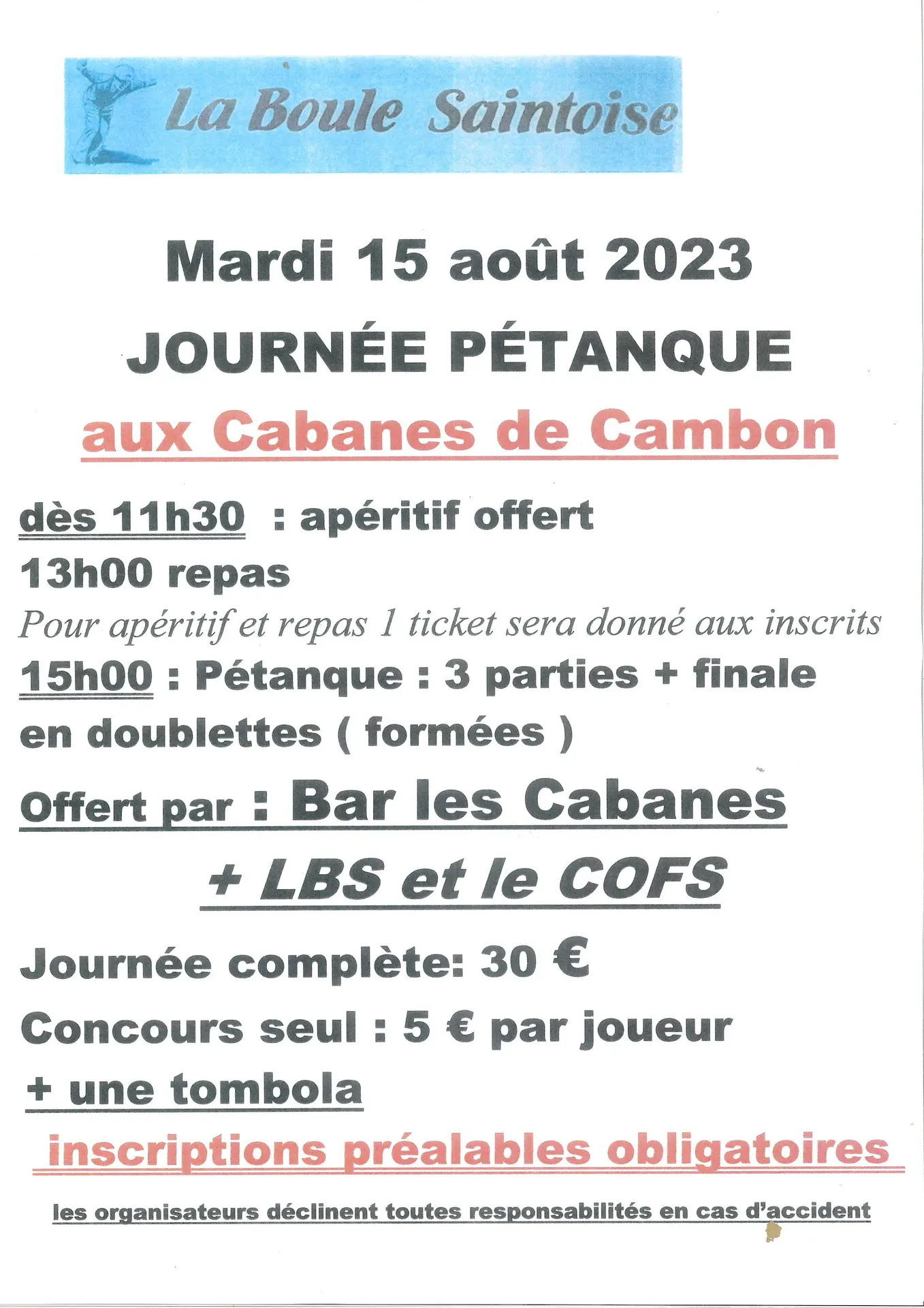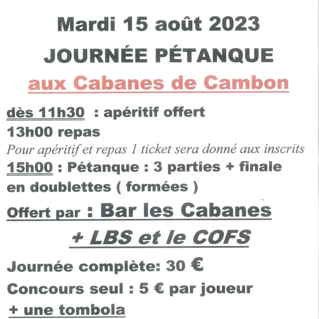 15h00, Tournoi de pétanque - 3 parties + finale en doublettes (formées)