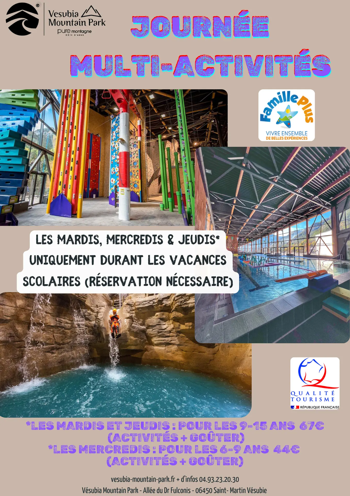 *Mardi et Jeudi: pour les 9-16 ans (escalade, piscine, grimpe ludique et canyon)