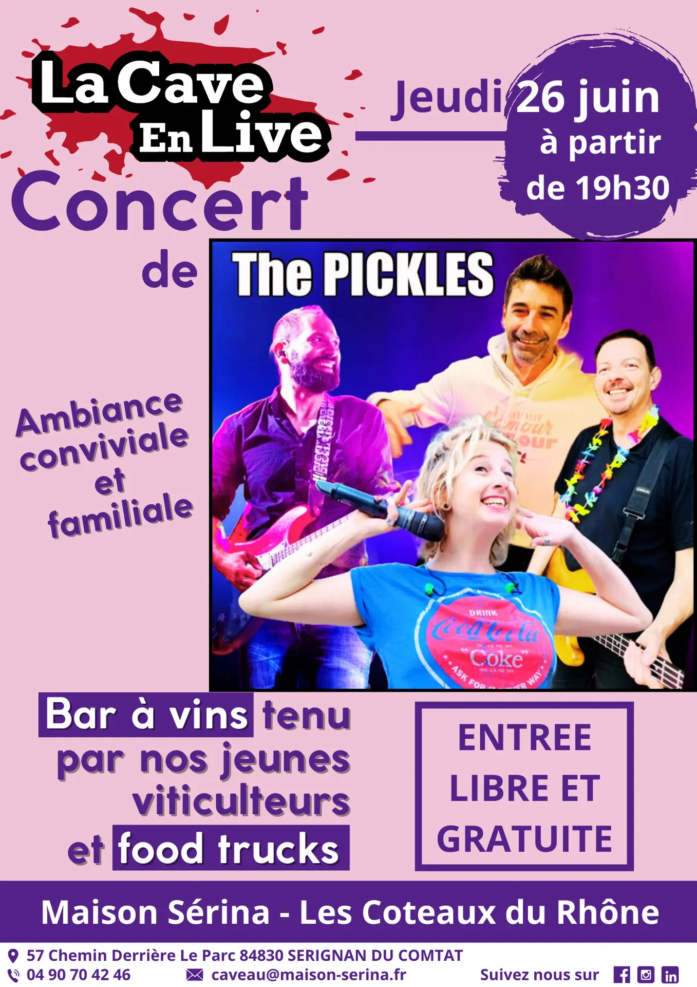 La Maison Sérina Les Coteaux du Rhône et ses jeunes coopérateurs vous offrent un concert gratuit de pop rock avec le groupe de pop rock"The Pickles" Présence de Food Trucks et Bar à Vins tenu par les jeunes coopérateurs. Ambiance conviviale et familiale