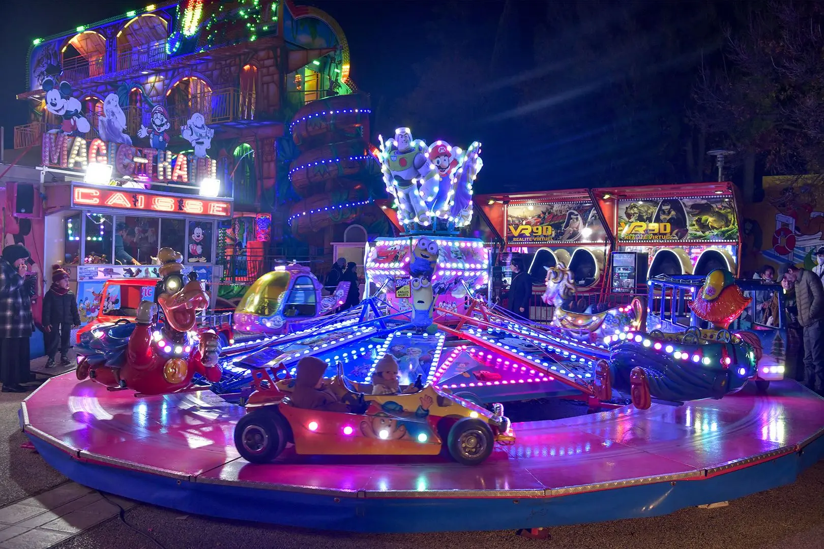 Palais du rire, trampolines, bulles sur l’eau, loteries de peluches, carrousel, chenilles, chaises volantes, tir à la carabine, maison hantée, machines à griffes, punching-ball, auto-tamponneuses... Des manèges pour les tout-petits et des attractions à sensations pour les plus grands.