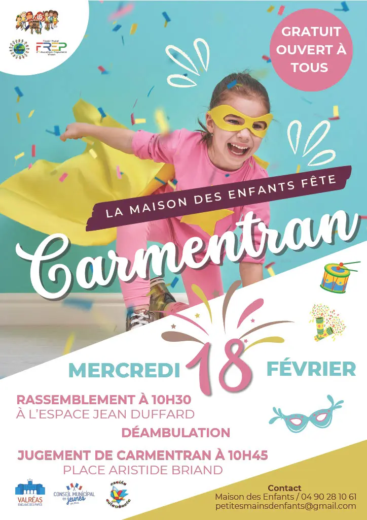 La Maison des Enfants (MDE) fête Carmentran dans le centre-ville de Valréas ! Au programme : rassemblement 10h30 devant l'Espace Jean Duffard, Déambulation dans le centre-ville et le marché puis jugement de Carmentran à 10h45 devant le Château de Simiane.